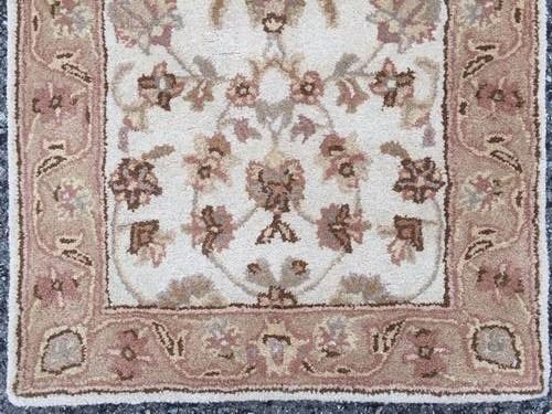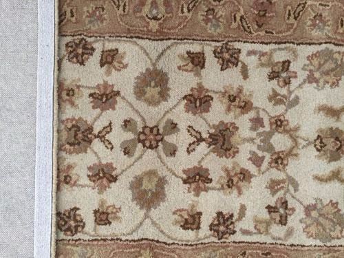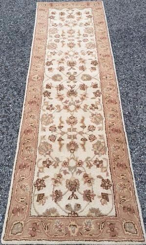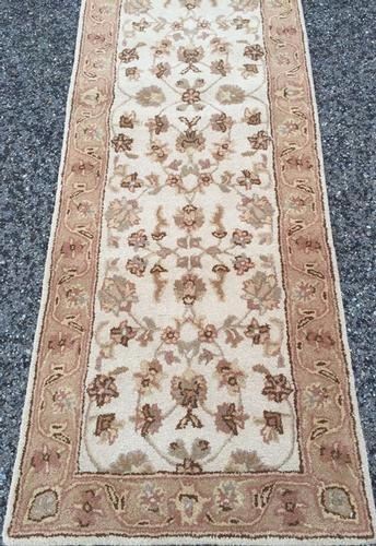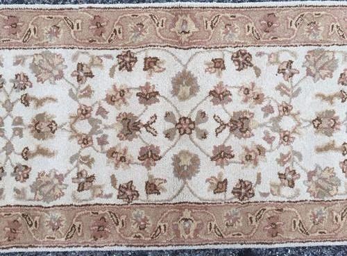 Very charming sultan-abad design Runner. 100%natural vegetable dye wool pile on cotton foundation. All natural vegetable dye and lush pile of beige background of a sultan-abad design on a light mustard border makes this a very appealing runner. Backing is for protection and added padding. The creases in this rug are due to fold. They are not a defect. Size: 8 feet X 2 feet 6 inches. Country of Origin: Nepal.