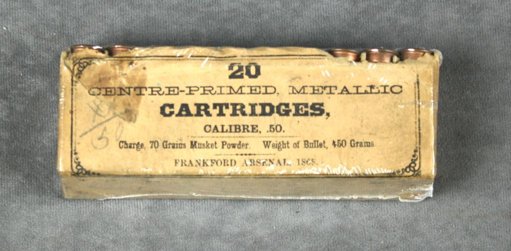 Very collectible early box of 20  “Centre-Primed, Metallic Cartridges –  Calibre, .50.” marked by Frankford Arsenal,  dated 1868 with 70 grain charge and 450 grams  bullet weight. This lot includes the twentyround and bottom half of the box (no lid) in  overall very good condition and clear shrink  wrapped for protection from the consignor.   Est.:  $200-$400.