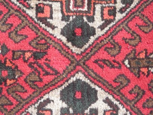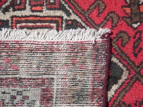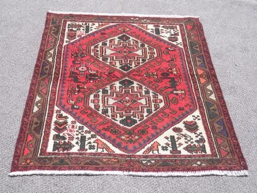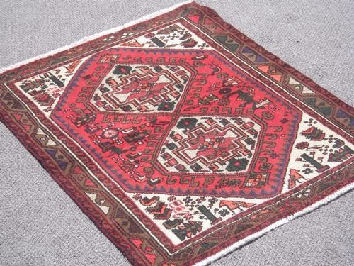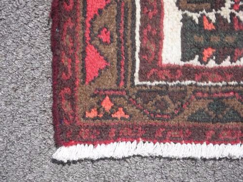 Very collectible handmade Persian Hamadan Rug. Made of fine quality baby lamb's wool pile on cotton foundation, all natural vegetable dye, incorporating a combination of tribal and geometric pattern on a red and white background, two large central medallions, crowned corners and an intricately detailed geometric multi layered border. Hand woven in City of Hamadan from Iran. Size: 4 feet 4 inches X 3 feet 4 inches.