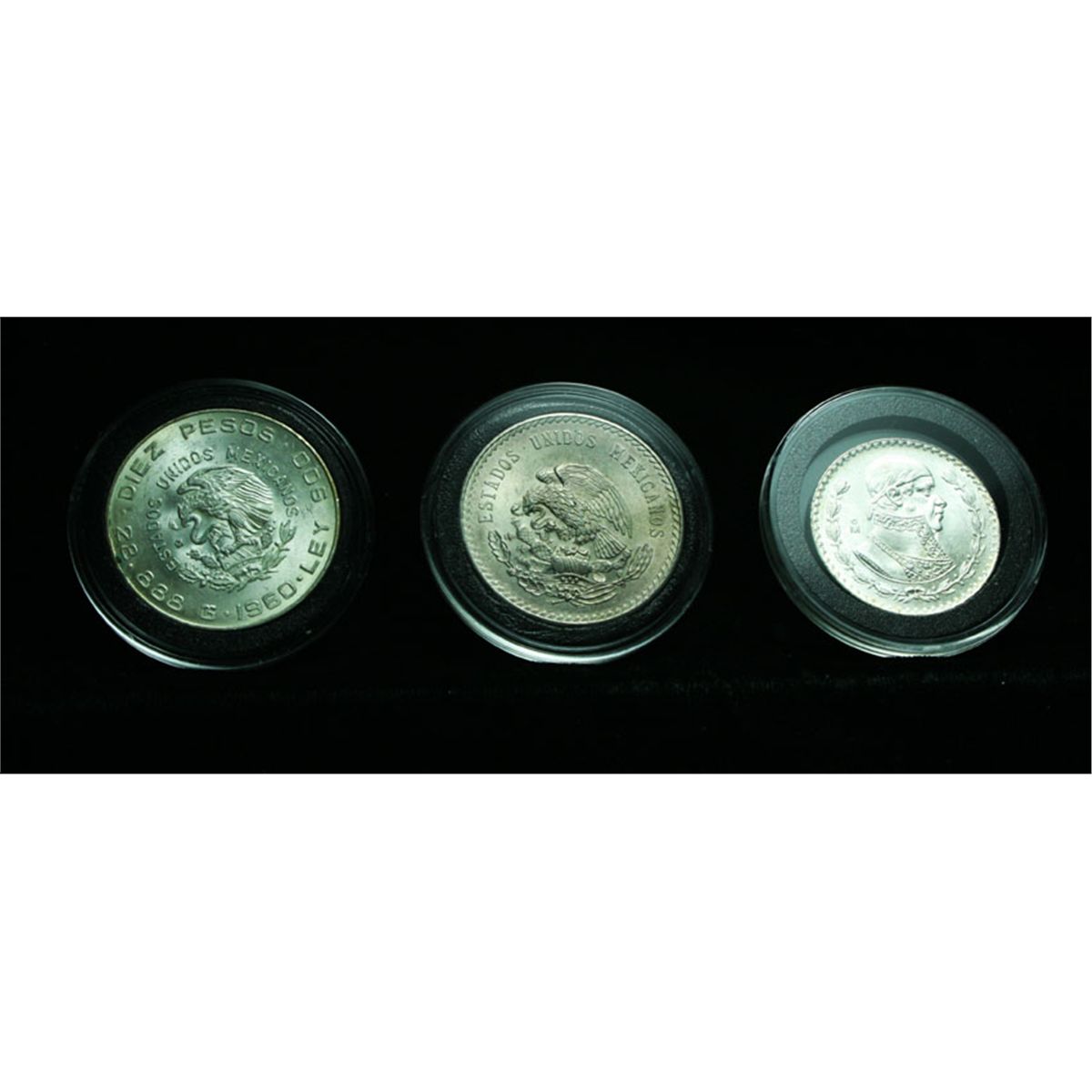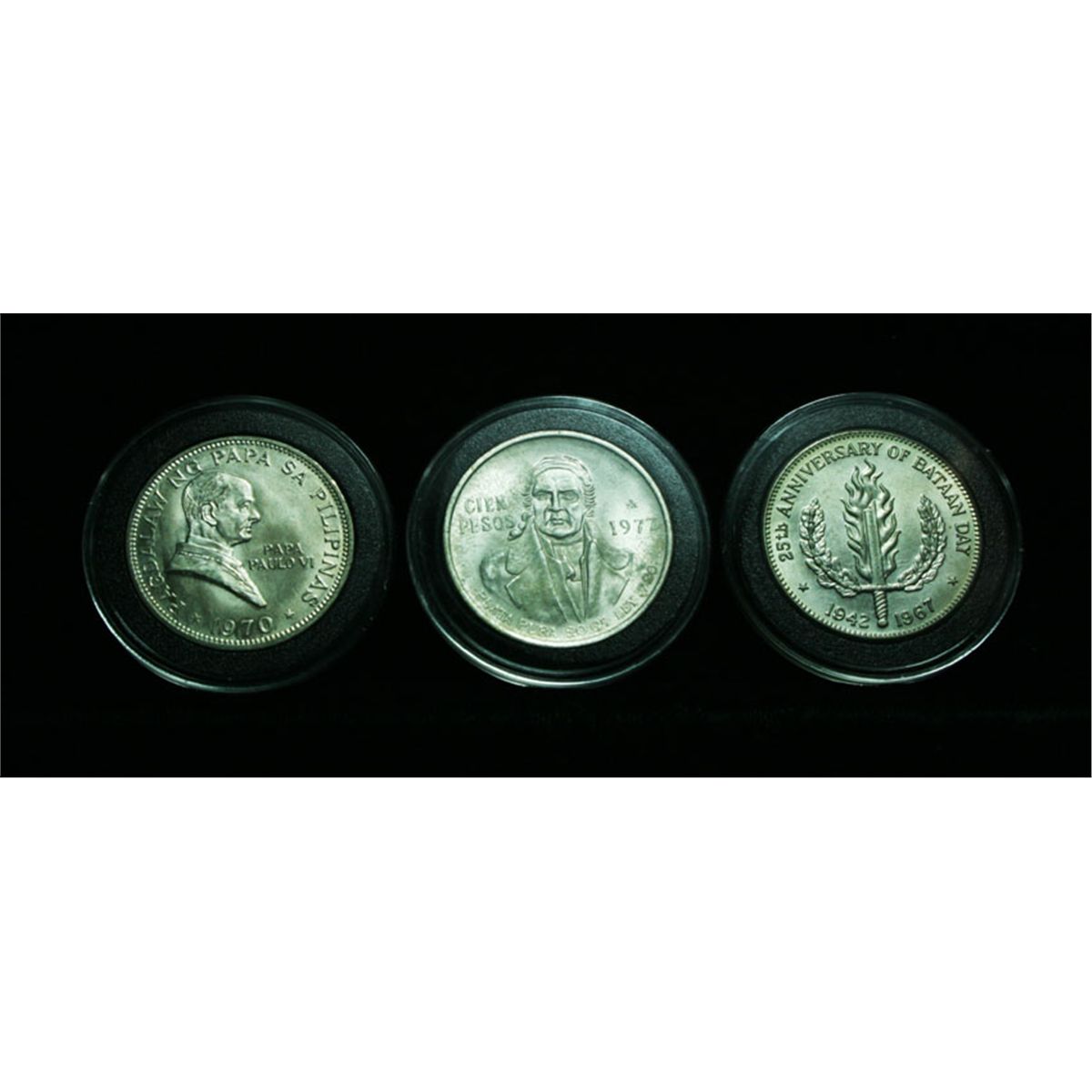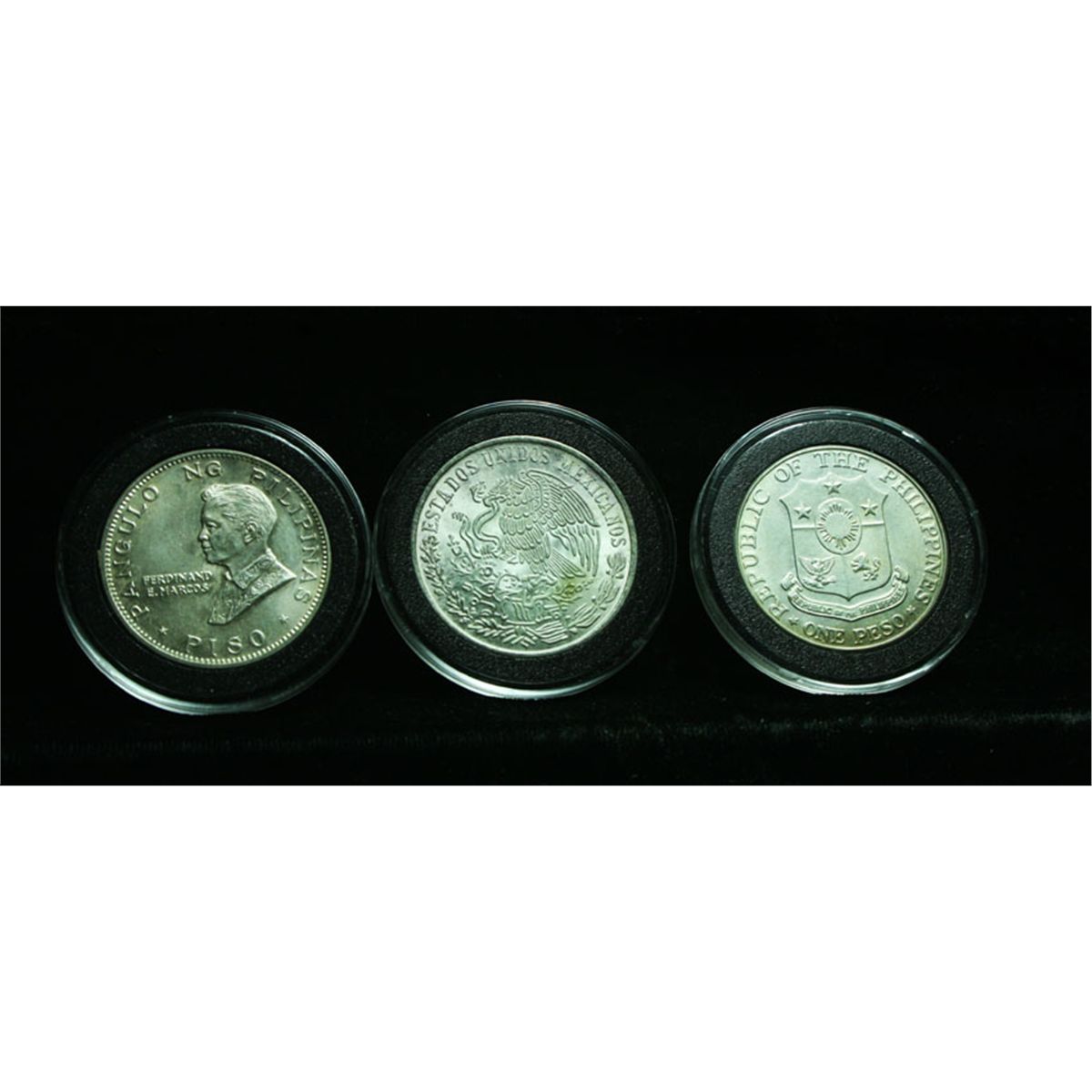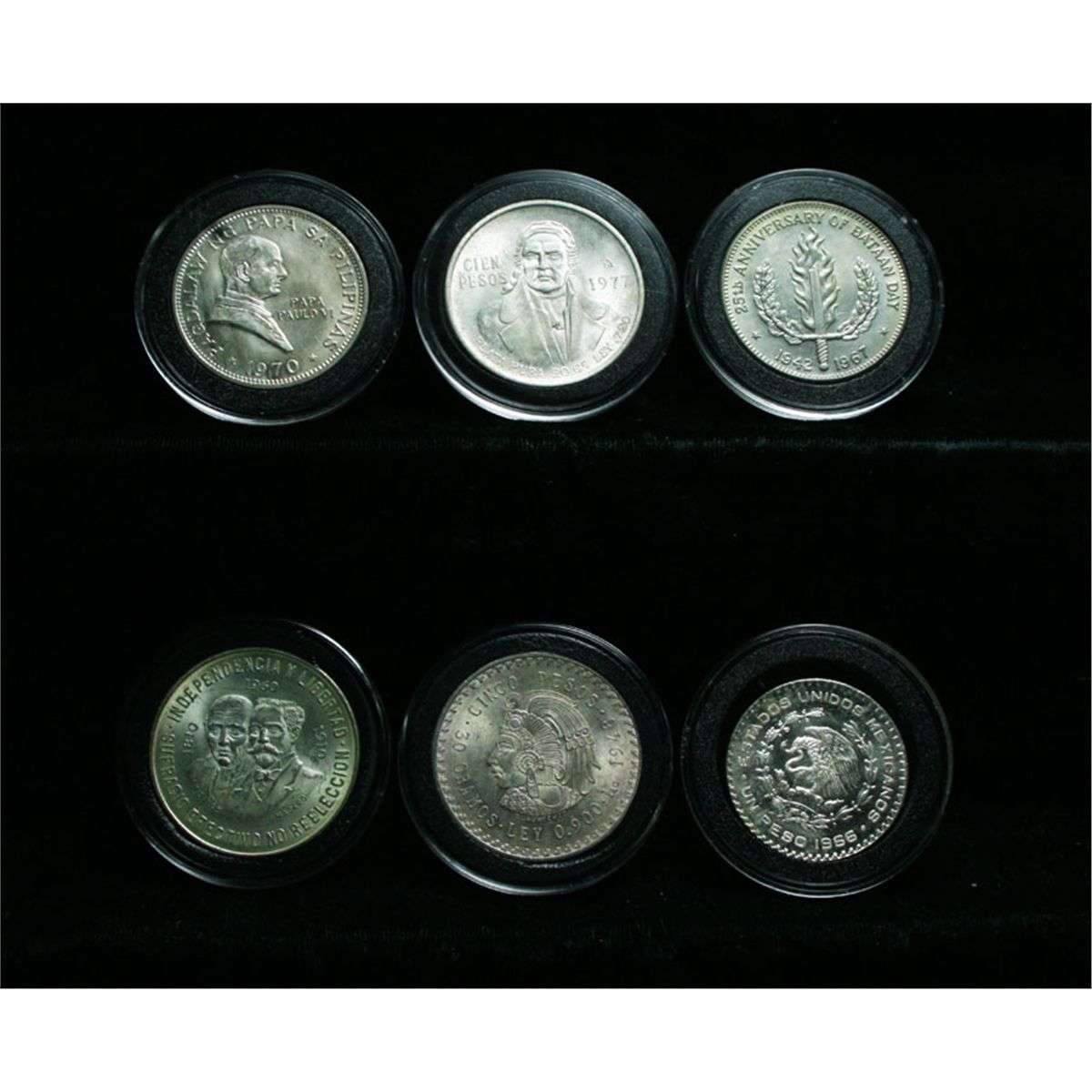 This is a Great Lot. Not only is it 3.7963 Ounces of Pure Silver, which at $32/Ounce Puts the Silver Value alone at $121.48, but it is made up of 6 Uncirculated coins, Including The very scarce and sought after Pope Paul VI/Ferdinand Marcos two headed coin commemorating the Pope's visit to the Philippines, mintage of only 30,000, its a high grade Unc. (.7653 Oz. Silver), The other 5 coins are as follows; United States of Mexico 1948 20 Peso (.86 Oz. Silver), United States of Mexico 1966 1 Peso (.051 Oz. Silver), United States of Mexico 1960 10 Peso (.83 Oz Silver), 25th Anniversary of Batan 1967 Philippine Peso (.76 Oz. Silver), United States of Mexico 1972 10 Peso (.52 Oz Silver), A really great lot, a few look Gem Uncirculated. Estimated Value $200