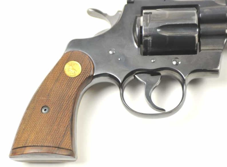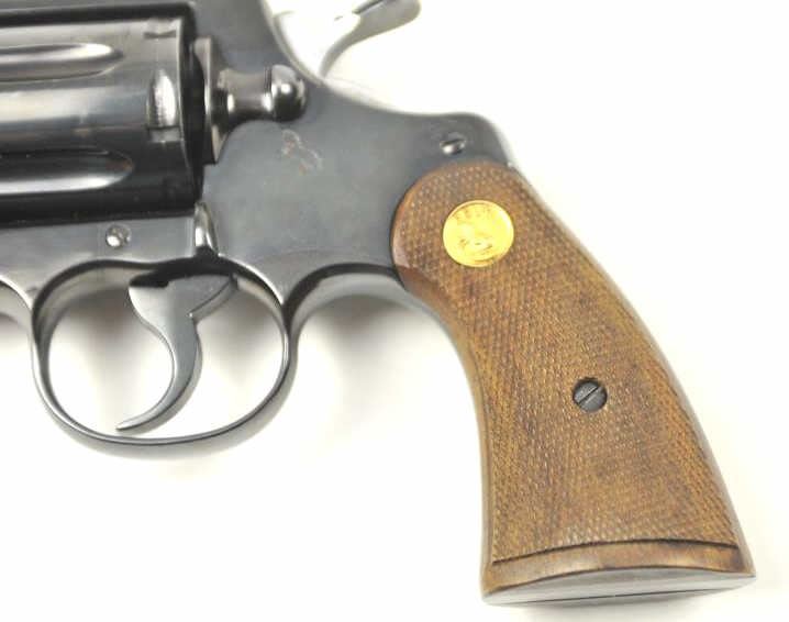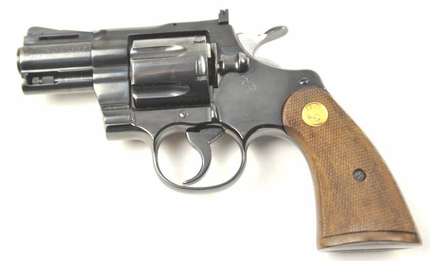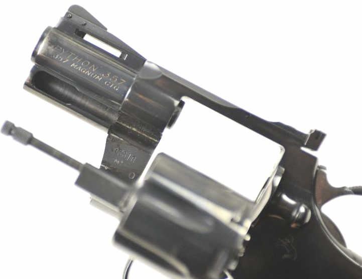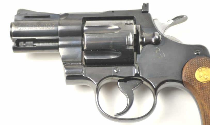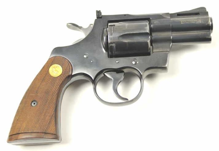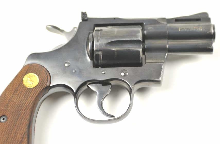 Very desirable Colt Python 2 ½” barrel, #93810, .357 Mag. cal., adjustable sights, with full checkered gold medallion grips. The revolver is in fine condition overall, showing 96-97% original blue finish, withlight muzzle and edge wear. The bore is very good, action is very good, grips are very good. Manufactured in 1969. Highly collectable and desirable in the 2 ½” barrel length. (C&R/PPT) Est. $2500-5000