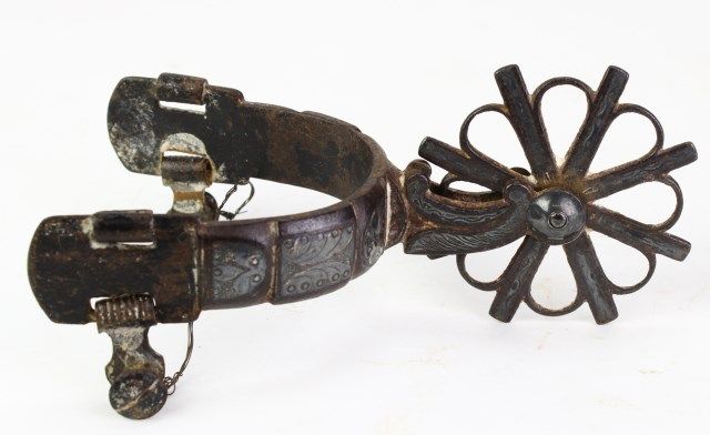 double silver mounted, engraved with swinging buttons and fantastic 2 1/2" pierced rowel. Est. 250-450