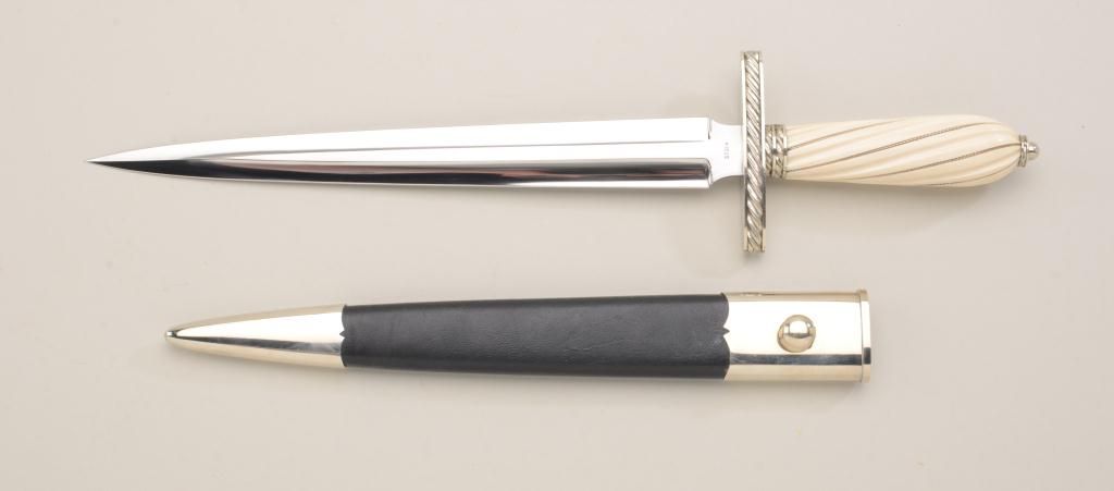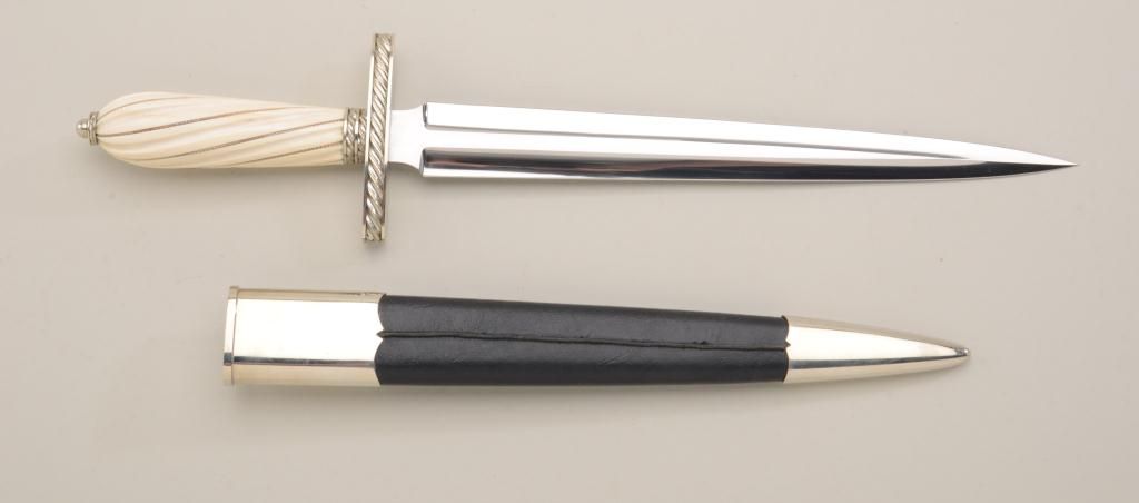 Very finely made custom knife by contemporary bladesmith, signed Kious. The style of the knife is influenced by English makers of the 19th century for exhibitions. The blade is a spear point measuring 11", knife is 15-3/4"overall. The polish and grind are excellent and the blade shows double grooves and precision manufacture. The guard is nicely filed and well made, the grip is turned and inlaid with wire. A polished steel mountedand leather scabbard is included. The best compliment we can give this knife is it resembles the best Sheffield knifes of the late 19th century and is as high a quality. Est.: $350-$700