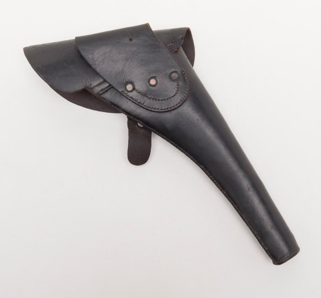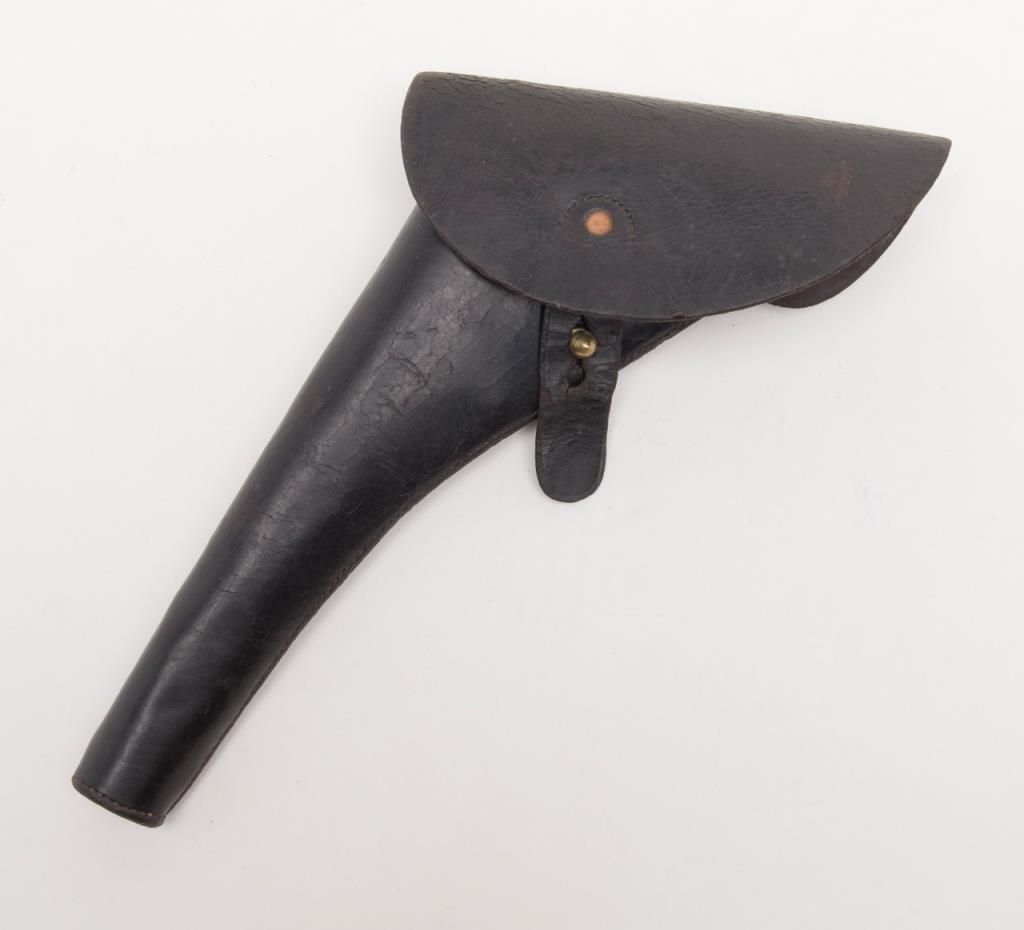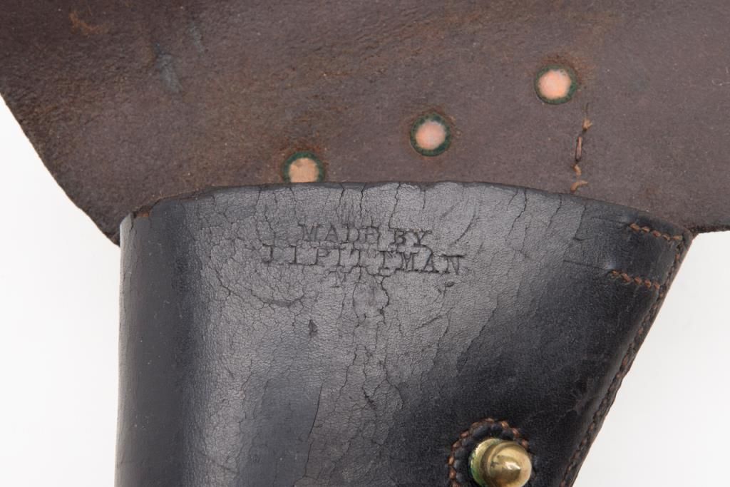 Very good original U.S. issue Civil War holster for Colt 1860 Army marked “made by J. Pittman” on the top inside edge of holster. The tab is intact as is the flap and loop. Seems are tight and the plug is retained. A very good plus conditionholster that is hard to find in this condition. Only minor cracking and small losses. Est.: $300-$600