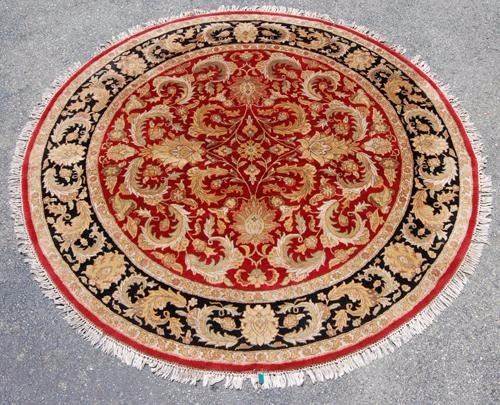 Gorgeous Agra inspired design Round Rug. Made of fine quality lamb's wool pile on cotton foundation, all natural vegetable dye, this beautiful Rug incorporates an Agra inspired floral pattern and utilizes a rich color palette. A very nice looking hand woven Rug. Size: 8 feet X 8 feet.