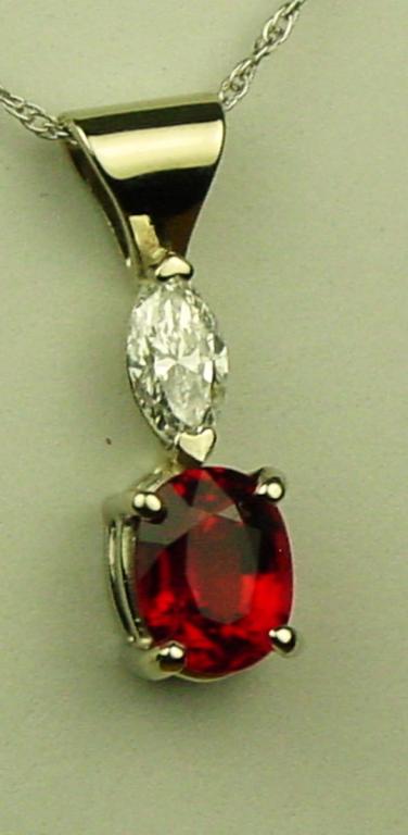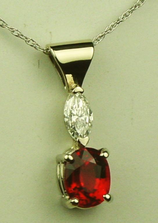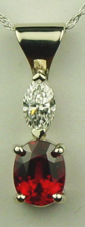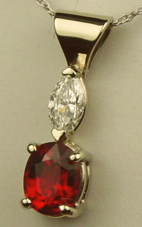 Very high quality 14 karat white gold ladies custom made pendant set with a fine oval red Ruby weighing 1.08 carat and side MQ shape diamond weighing 0.27 carats of E-F color and VS/SI clarity. Retail $4,250.00 Estimate$1,200-$2,000