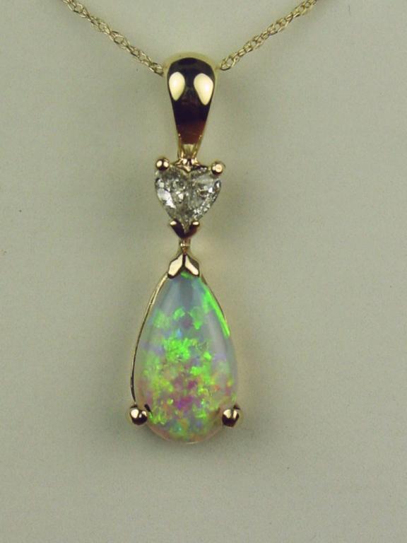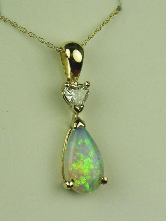 Very high quality 14 karat white gold ladies custom made pendant set with a fine pear shape black opal weighing 1.50 carats and a side heart shape diamond weighing 0.26 carats of G-H color and SI clarity. Retail$2,950.00 Estimate $1,000-$1,500