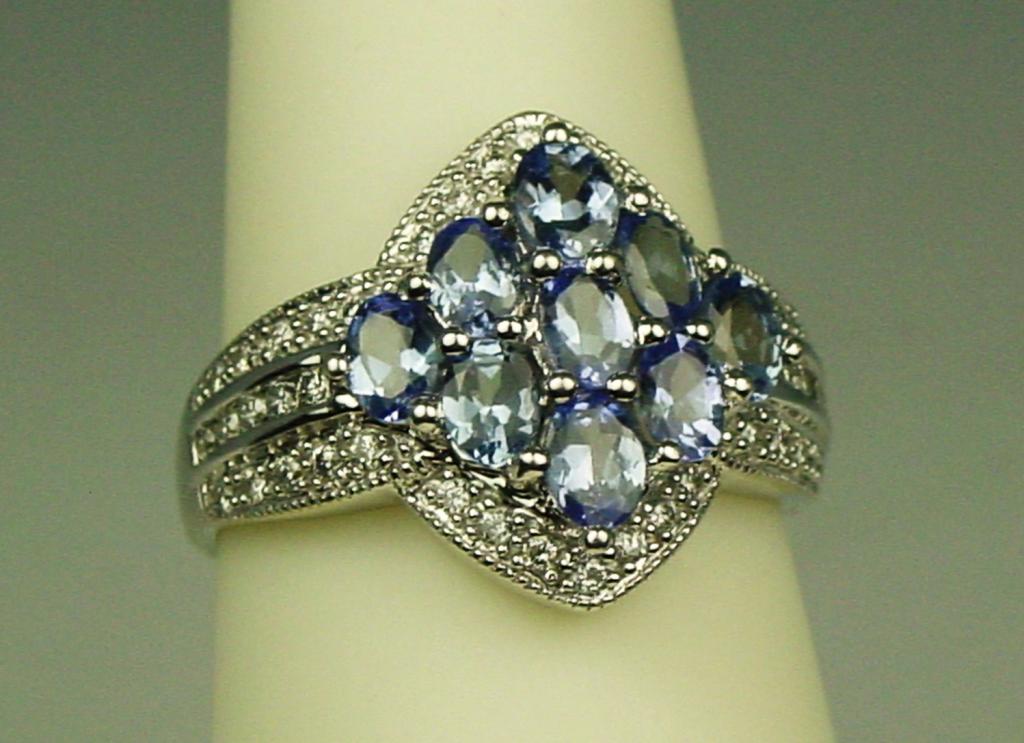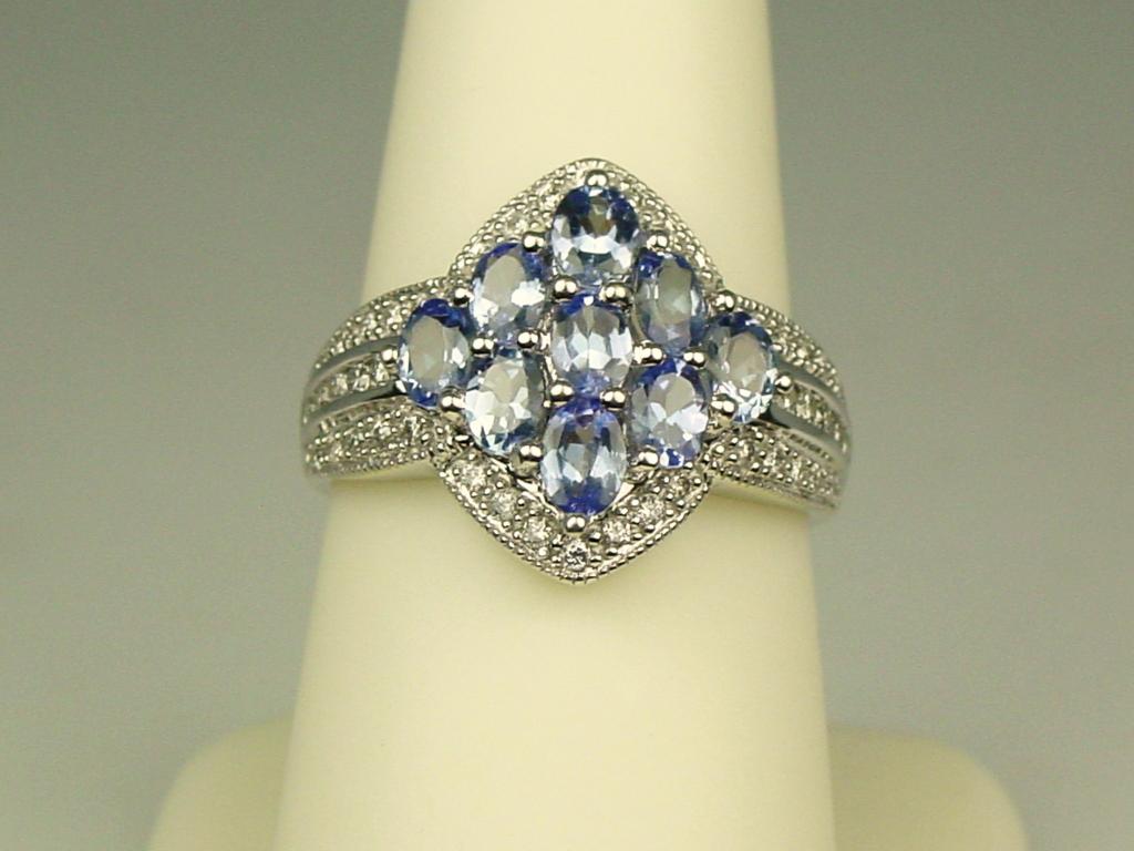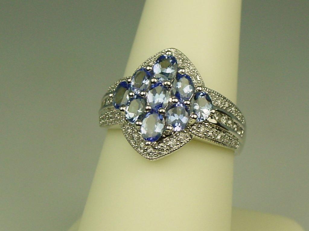Very high quality 14 karat white gold ladies  custom made ring set with 9 matching oval  Tanzanites weighing approx. 3.00 carats and  channel/pave set with 44 round brilliant cut  diamonds weighing approx. 1.00 carat of F-Gcolors and VS/SI clarity. Retail $3,950.00  Estimate $900-$1,800 Very labor intensive.