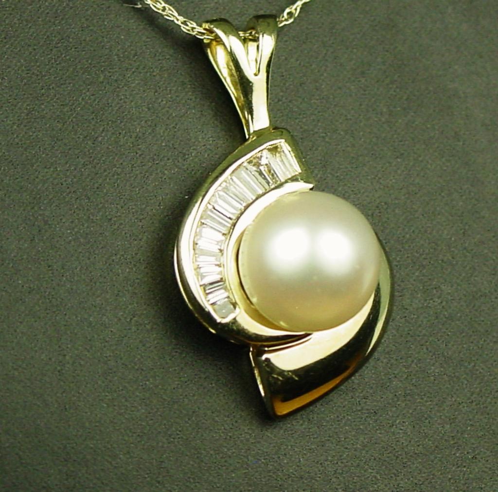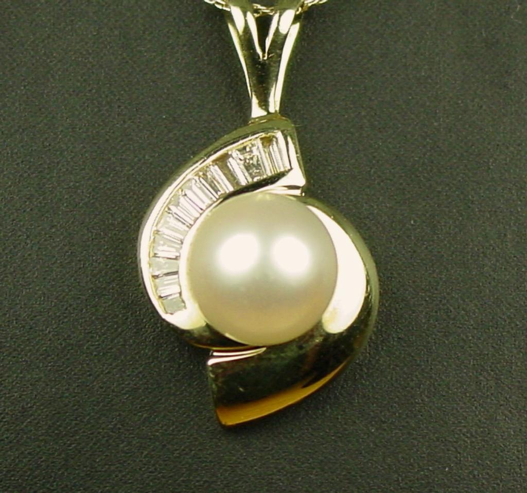 Very high quality 14 karat yellow gold ladies  custom made necklace set with a center round  rose pink cultured pearl over 8.00 MM in  diameter and channel set with 11 baguette cut  diamonds weighing approx. 0.40 carats of G-H colors and VS clarity. Retail $2,450.00 Estimate $600-$1,200