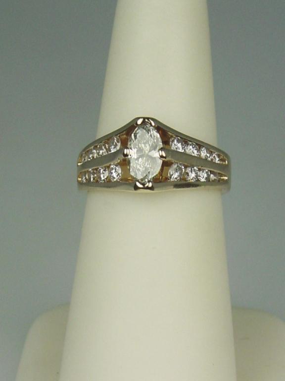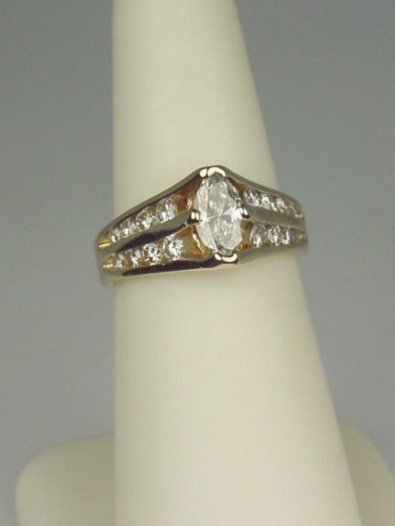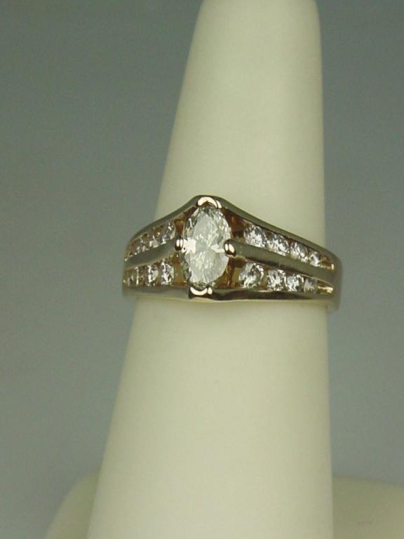 Very high quality 14 karat yellow gold ladies custom made ring fine set with a center MQ cut diamond weighing approx. 0.50 carat of H-I color and VS clarity and channel set with 16 round diamonds weighing approx. 0.80carats of E-F colors and VVS clarity. Retail $4,950.00 Estimate $1,200-$2,000