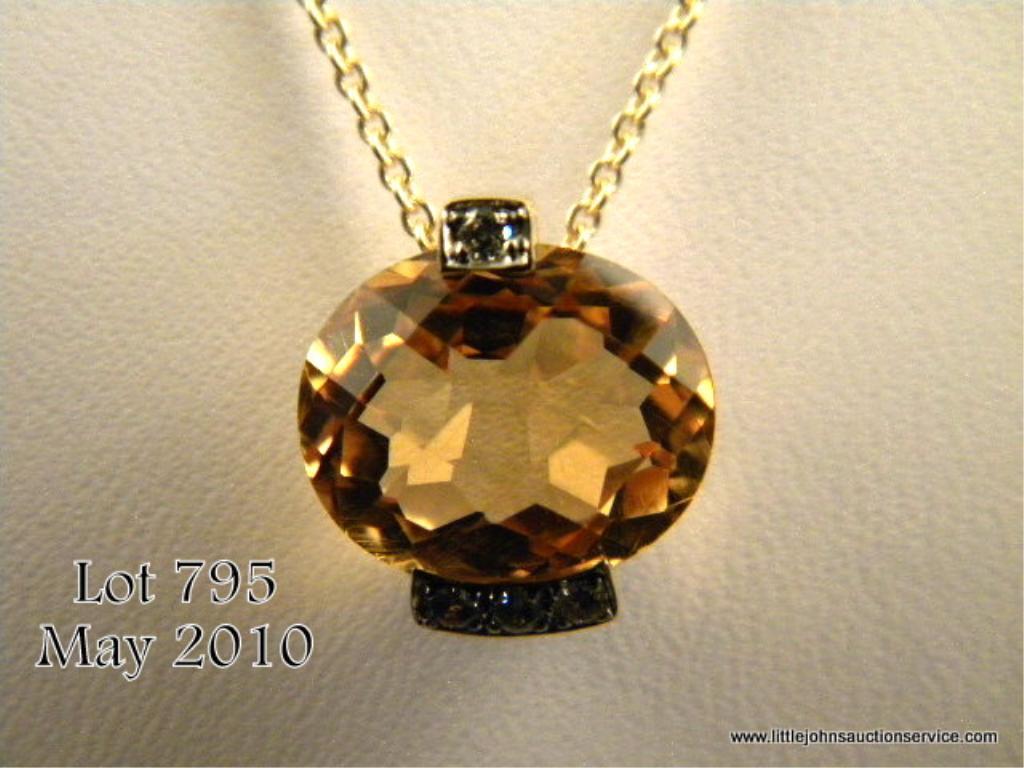 Very high quality 14 karat yellow gold ladies pendant made by ‘Krementz’ fine set with a checkerboard cut citrine weighing approx. 5.00 carats and 4 side pave set diamonds of G-H colors and SI clarity. Retail $995.00 Estimate $300-$500A nice item