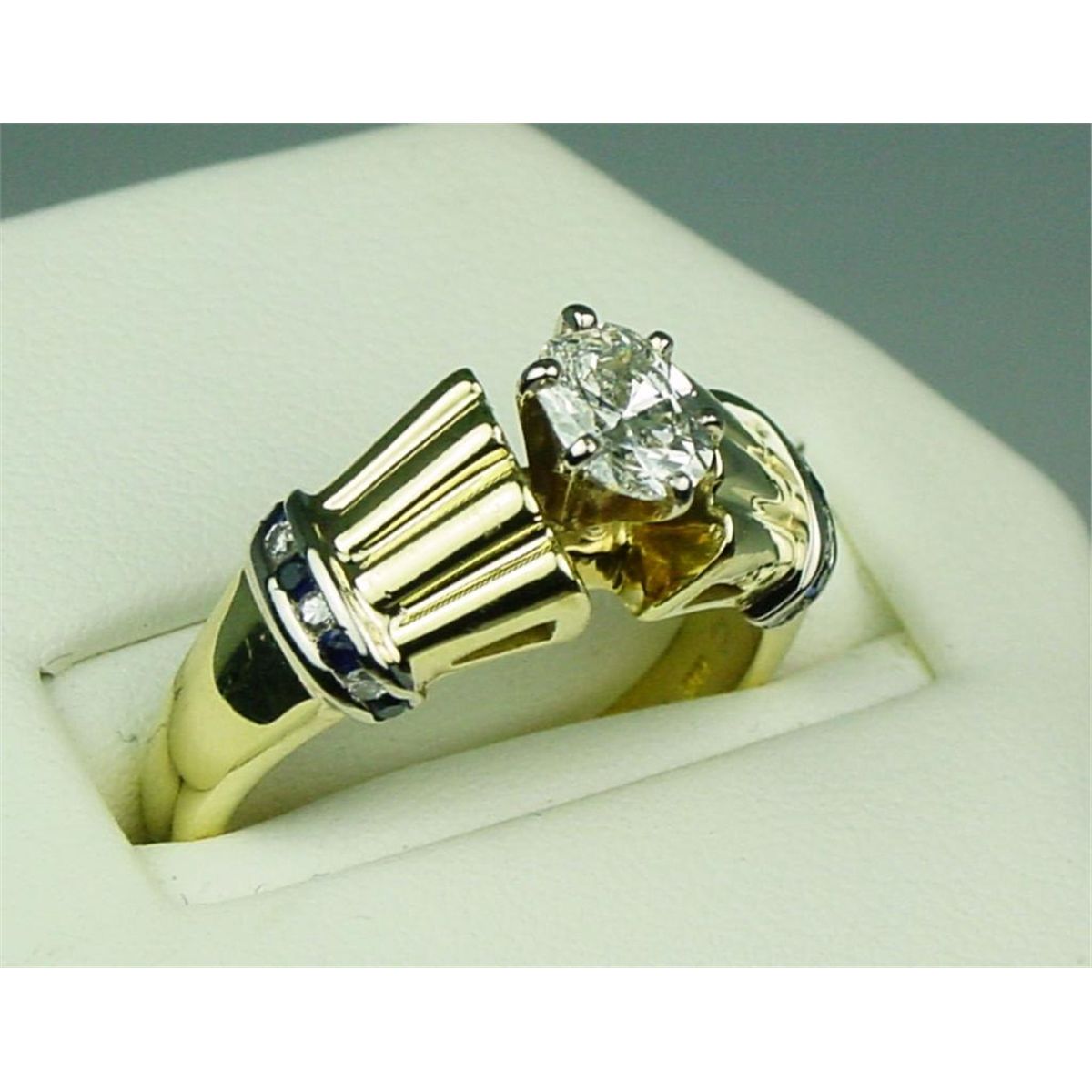 Very high quality 18 karat heavy yellow gold ladies custom made ring by the ‘DIANA’ collection set with a fine center oval cut diamond weighing approx. 0.75 carats of G-H color and VVS/VS clarity and side channel set diamonds and sapphires. Retail $5,000-$6,000 Estimate $2,000-$3,000 A fine item