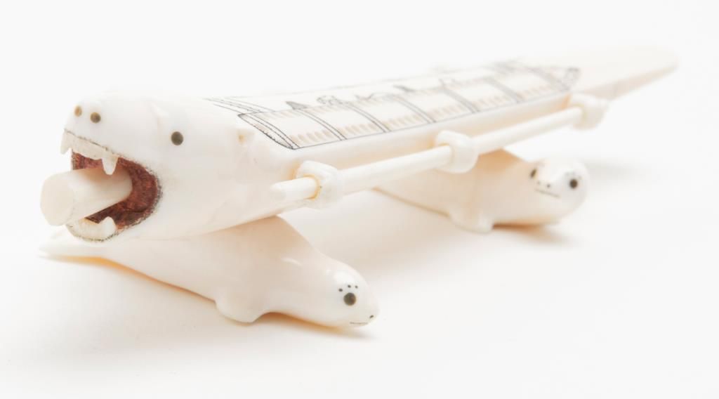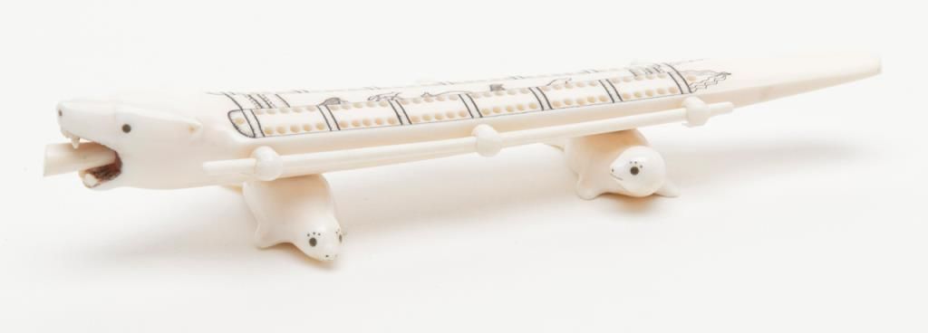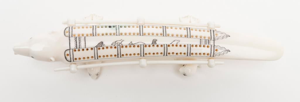 Very high quality and detailed carved Walrus tusk cribbage board of polar bear with seal supports; Scrimshaw decorated, approx. 9” overall. Est.: $175-$350.