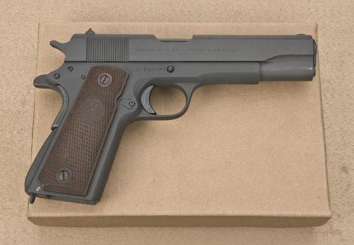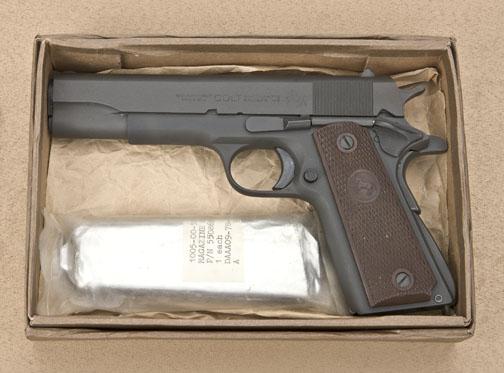 Very interesting Colt Government Model semi-auto pistol, .45 cal., parkerized finish, brown checkered hard rubber grips, #327433-C. This gun is in overall excellent condition and appears to be original in itsparkerized finish although we have not seen one of these early 1950’s Colts like this previously; approx. 99% finish remains, edges and markings are sharp, excellent bore, crisp action, fine grips; accompanied by aKraft style box with foil wrapped and sealed magazine. This gun should be further researched with the Colt Historian and may be a real “sleeper”. As it could be a martial or para military purchase. Est.:$500-$850.