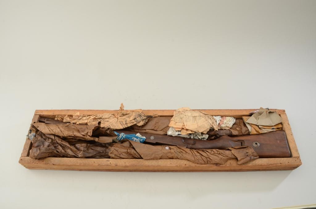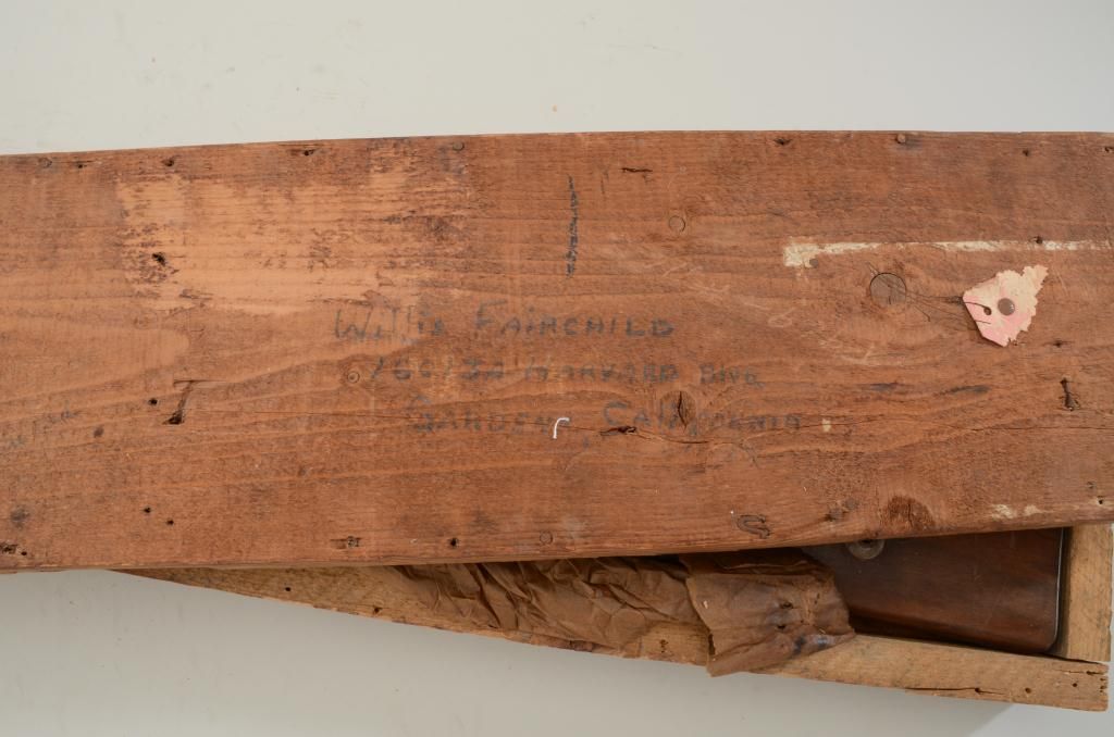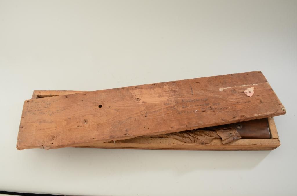 Very interesting out-of-the-family Mauser Model 98 bolt-action rifle, #8790 with “bring back” papers dated June 26, 1945, in cosmoline, wrapping paper and original shipping box sent home from Germany at theend of the war by an American GI; one of two sent home by First Lt. Jack Fairchild to his brother Willis Fairchild of Gardena, CA. The family reports this gun and the following lot were found by Lt. Fairchild in a boxcar inGermany d was sent home where the family opened the box but never assembled it. We cannot find any nazi inspection markings leading to an assumption that it was one of the last ditch Mausers to be made for the war effort that ended before it could be inspected and supplied to troops. We will assemble the gun for te successful buyer. A great “bring back” with a great history! Est.: $750-$1,500.