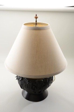 Very large Japanese bronze base for lamp, scenes of animals with quality shade; 20th century reproduced from 19th century Japanese original; high quality, great for the game room or den. From the estate of RobertPetersen. Est.: $600-$1,200.