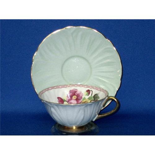 This is a very beautiful cup & saucer made by Shelley 1925-1940 in England with with beautiful Green background and flower inside painting and cabbage leaf motif on outside of cup and on saucer and in good condition and scalloped rims on cup and saucer. Saucer's W:5.3/4" Cup's H:2.1/2"- W:4.1/4" .