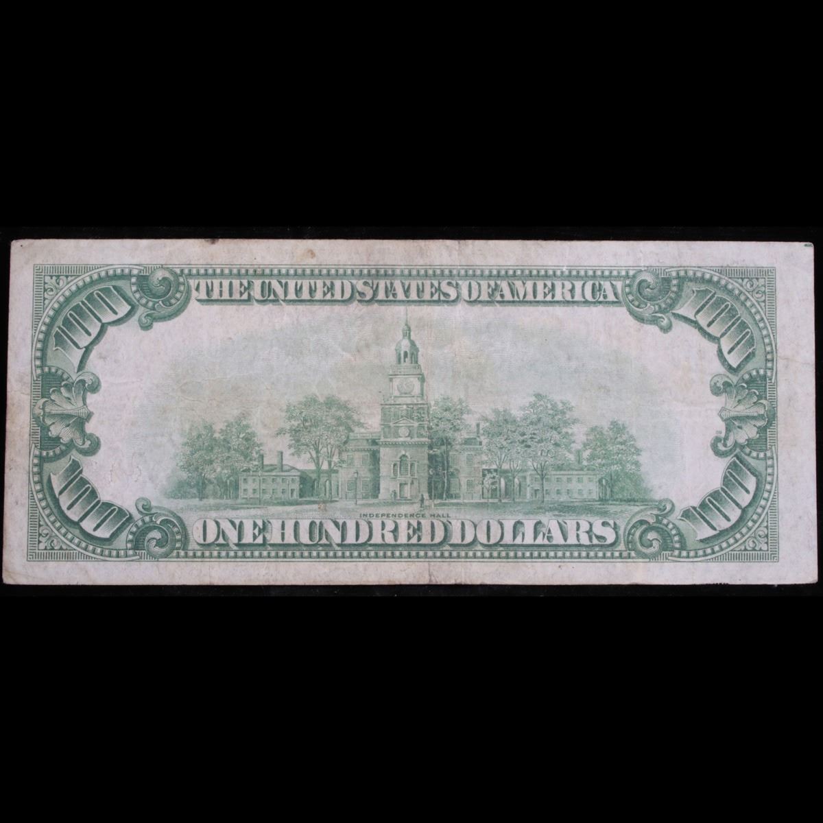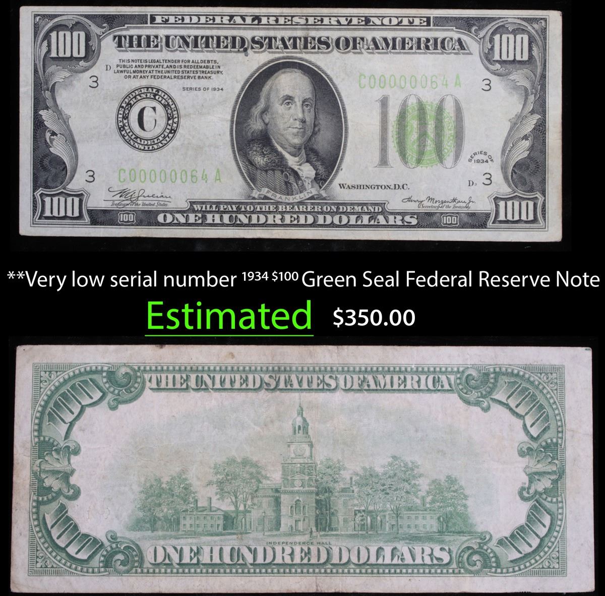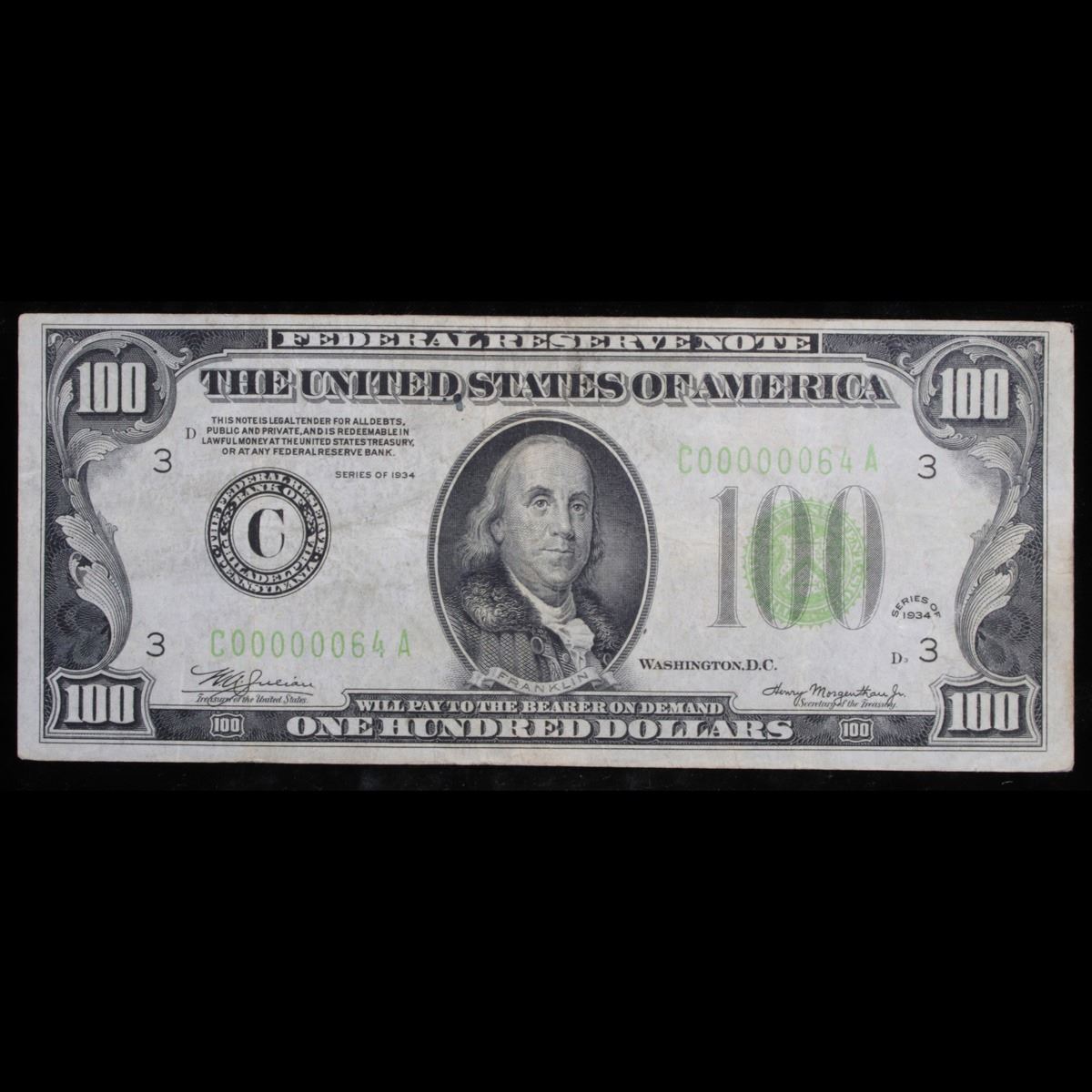 **Very low serial number 1934 $100 Green Seal Federal Reserve Note Grades xf. Very Low Serial Number 64 with 6 leading zero's. Series of 1934 green seal $100 bills were signed by W.A. Julian as the Treasurer of The United States and by Henry Morgenthau Jr. as the Secretary of the Treasury. Series of 1934 one hundred dollar bills have a picture of Benjamin Franklin on the front and Independence Hall on the back. All series of 1934 one hundred dollar bills were printed in Washington DC. However, they were issued for all twelve Federal Reserve districts. The twelve districts are Boston, New York, Philadelphia, Cleveland, Richmond, Atlanta, Chicago, St. Louis, Minneapolis, Kansas City, Dallas, and San Francisco. Series of 1934 one hundred dollar bills with a green seal are called Federal Reserve Notes. As such they have the following nomenclature on them: “This Note Is Legal Tender For All Debts, Public And Private, And Is Redeemable In Lawful Money At The United States Treasury, Or At Any Federal Reserve Bank.” And “Federal Reserve Note The United States Of America Will Pay To The Bearer On Demand One Hundred Dollars” – “The United States of America One Hundred Dollars” Remember that nothing from 1934 will ever say “In God We Trust”. 1934 $100 green seals with low serial numbers will certainly command a premium. If the serial number of your bill has six or seven leading zeros then it will certainly command a significant premium. Five leading zeros might command a premium.