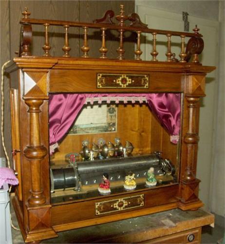 Très belle boîte à musique de gare avec 3 automates chinois jouant sur 6 cloches et 3 poupées qui dansent. Mouvement à double barillet avec deux ressorts et cylindre sur 3 peignes à 8 mélodies, avec monnayeur à 20 cts.Le tout en très bel état, env. 1890