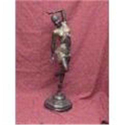 This is A very nice Bronze Sculpture in Egyption style and in perfect condition(two small chips on the bottom of the Marble base). The Bronze Sculpture is standing on A round Marble Base 1" tall and it is not signed. H:27"- W: on the base 8".