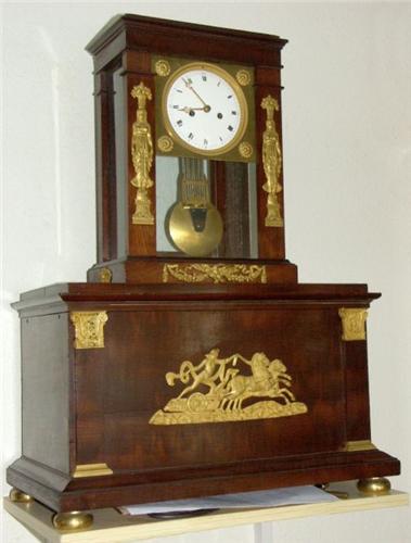 Très belle pendule Empire à musique à jeux de flûtes, signée ANTne COLIAX, sonnerie avec roue de compte sur la platine arrière, une seconde roue de chaperon montée sur la première sert de déclenchement de l'orgue au passage des heures. Jeux d'orgue 16 flûtes avec rouleau à picots en bois, train de roue avec fusée et chaîne. Cabinet de base en acajou, figures et appliques d'inspiration égyptienne en bronze doré. Pendule ayant appartenu à l'Empereur Napoléon Ier (lettre jointe!)