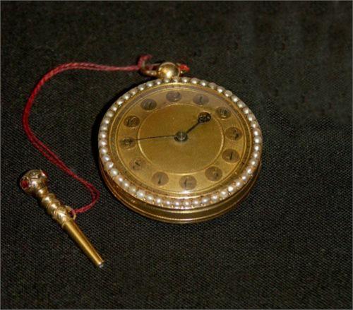 Très jolie montre de poche en or 18cts avec perles et médaillon en émail avec bouquet de fleurs, cadran en or avec chiffres arabes à cartouches, échappement à roue de rencontre, époque Louis XVI