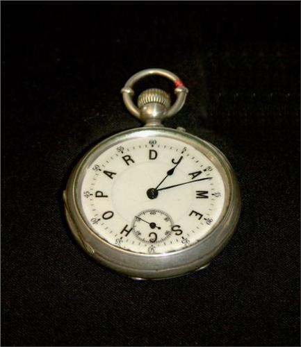 Très belle montre en argent guilloché et émail, signée, au lieu des chiffres des heures, en toutes lettres autour du cadran JAMES CHOPARD, double fond richement guilloché et gravé: «or ces trois choses demeurent: LA FOI, L'ESPERANCE ET LA CHARITE 1876», en très bon état