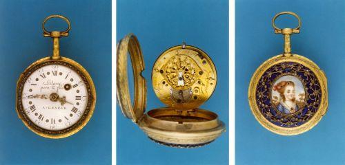Très belle montre de poche, boîte dorée au mercure à fond émaillé et décorée avec des petits brillants, signée BLANC PERE & FILS A GENEVE, échappement à roue de rencontre, époque 1790