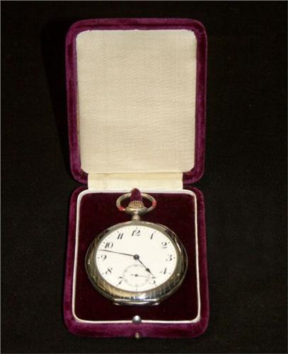 Très belle montre d'école en argent 875 niellé à motif floral, cadran émail blanc serti (sans pied) avec chiffres arabes, mouvement blanc No 3 avec un chaton vissé, échappement micrométrique (col de cygne), env. 1930, avec coffret