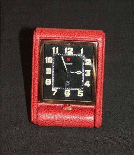 Très joli réveil de table en métal recouvert de croco rouge, avec réserve de marche (8 jours ), signé JAEGER LE COULTRE, années 1930