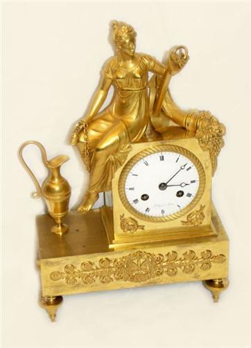 Très jolie pendule de table en bronze doré représentant l'abondance, cadran en émail blanc à chiffres romains, aiguilles Breguet en acier bleui, signée L'ECHOPIER A PARIS, mouvement sonnerie sur cloche heures et demies, suspension à fil, env. 1810, en très bon état
