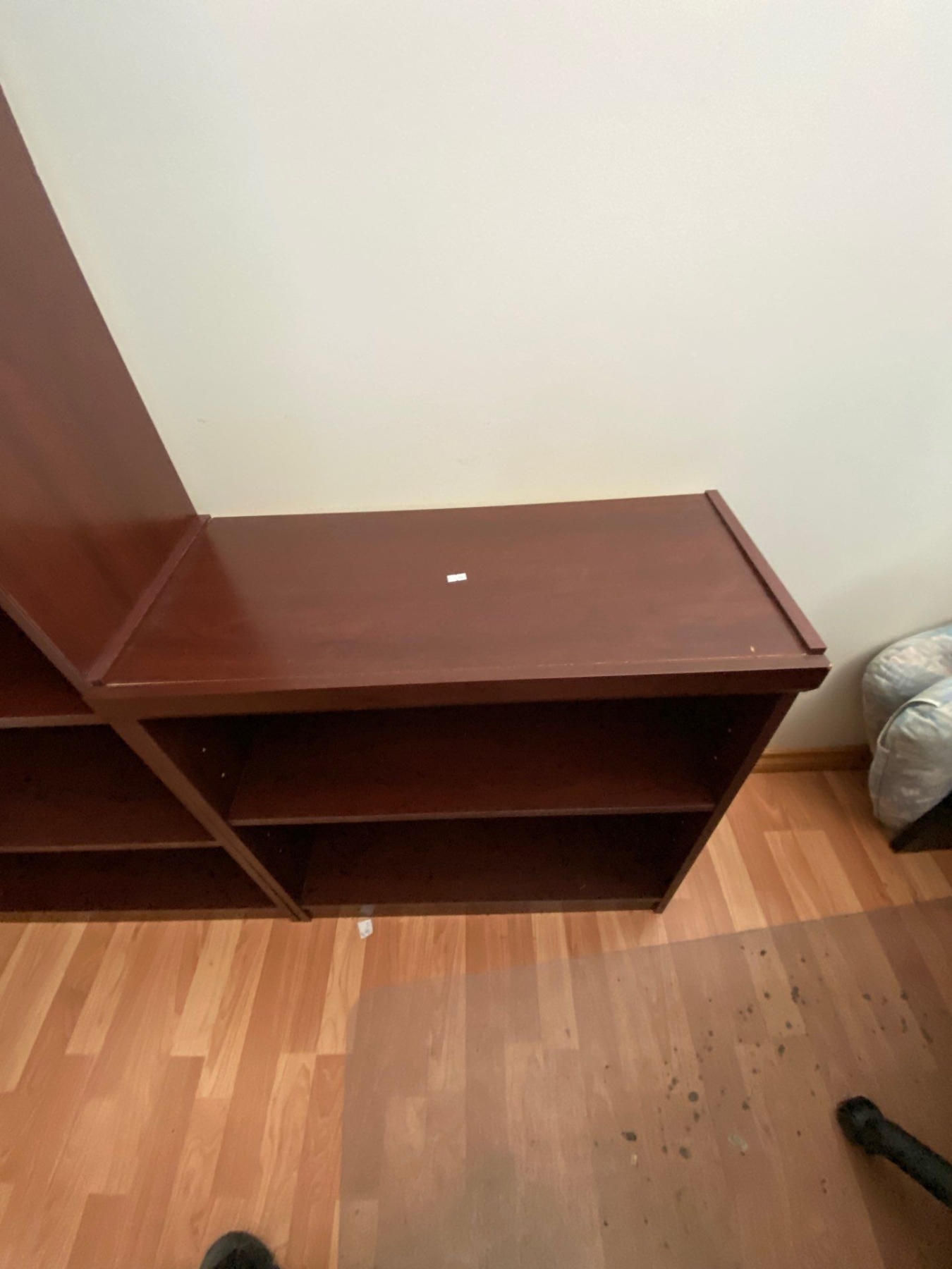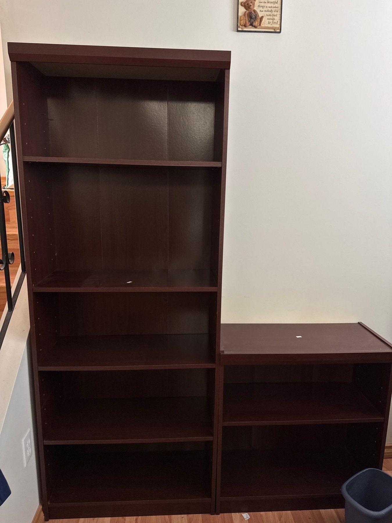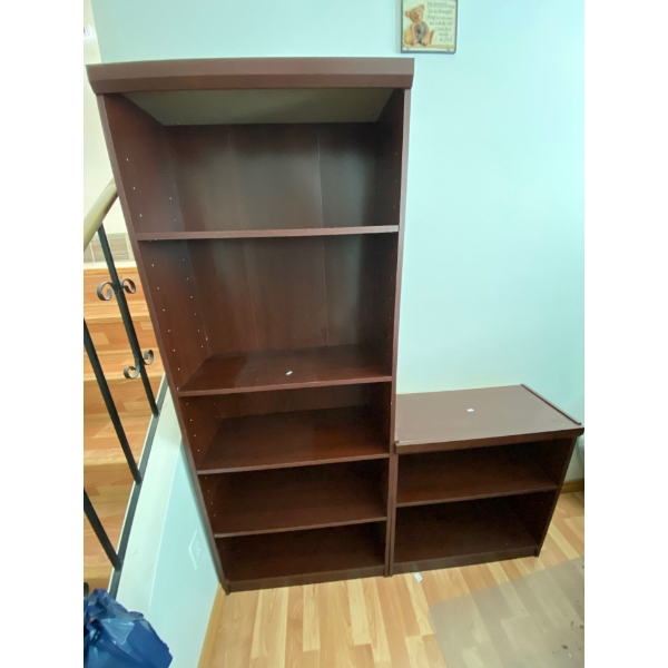 Very nice bookshelf and side bookshelf 71 1/2 inches long by 28 inches wide by 12 1/2 inches deep and the side piece is 28 inches long by 29 1/2 high by 12 1/2 deep