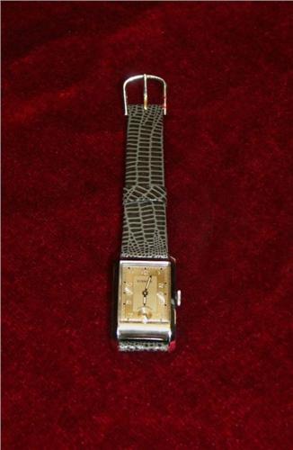 Très jolie montre-bracelet rectangulaire en acier, signée DAMAS, aiguilles au tritium, mouvement de forme, années 1940, comme neuve