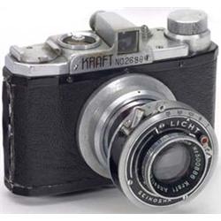 Kraft Works, Japan, 4 x 4 cm, Kraft Anastigmat 3,5/60, Verschluß Seikosha Licht 1/25-1/100 Sek., B u. T. - Sehr seltene Metall-Tubuskamera. Very rare metal camera with telescoping front. - (3-/3) - € 350/550 - (62/102)