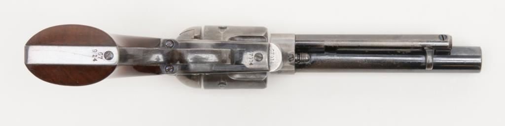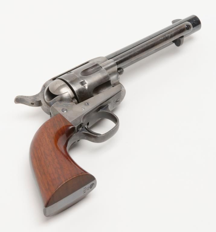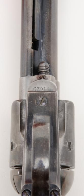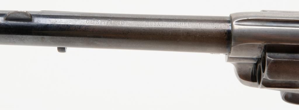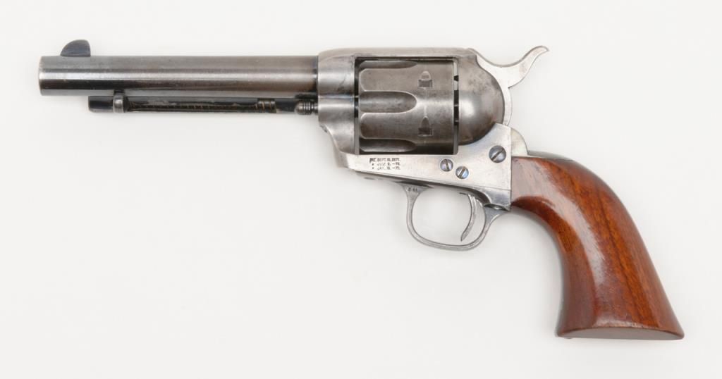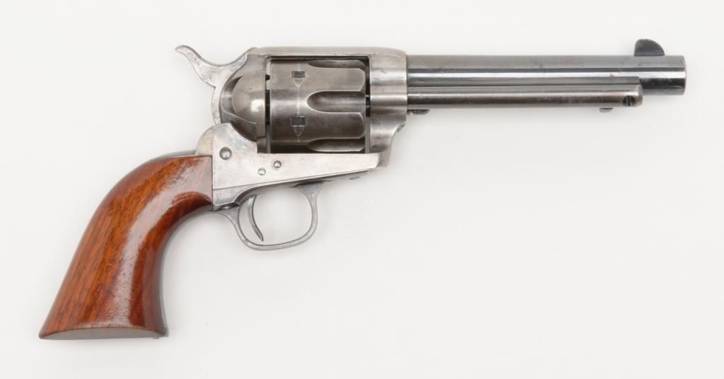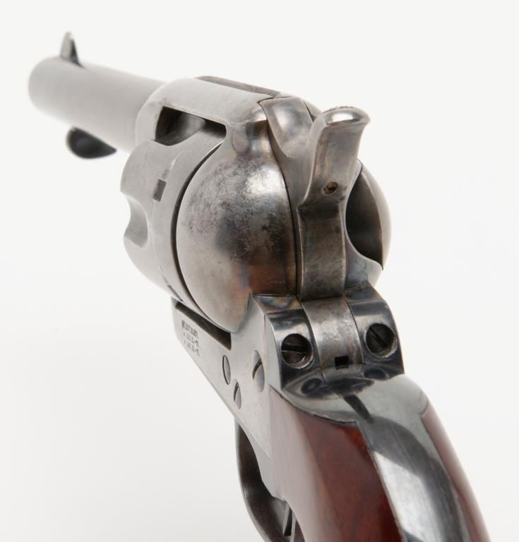 Very rare Colt SAA revolver, .44 S&W Russian cal., 5-1/2” barrel, blue and case hardened finish, wood grips, #67914 in overall fine condition showing considerable original blue on barrel, ejector rod housing and straps; traces of mutedoriginal blue finish in flutes of cylinder, several areas of original case colors on frame and considerable original case colors on hammer; crisp action, fine bore, fine grips with majority of original finish, “R 44” marked on left fronttrigger bow; accompanied by three factory letters dated April 2, 1959, Nov. 4, 2005 and Sept. 6, 2013 confirming caliber, barrel length and blue finish with type of stocks “Not Listed”; Special Notation on last two letters is “Pruss.”; allletters note shipment to Colt’s London Agency, London, England, shipped May 26, 1881, 12 guns in shipment. The 1959 letter also notes: “The revolver listed above appears to be a genuine COLT and the reason the Colt trade-mark is not stamped on the frame was due to the fact that we did not start stamping the Colt trade-mark on the Single Action models until about 1891 or 1892”. (letter signed by R.H. Wagner, then Manager of the Parts & Records Dept.). According to The Official