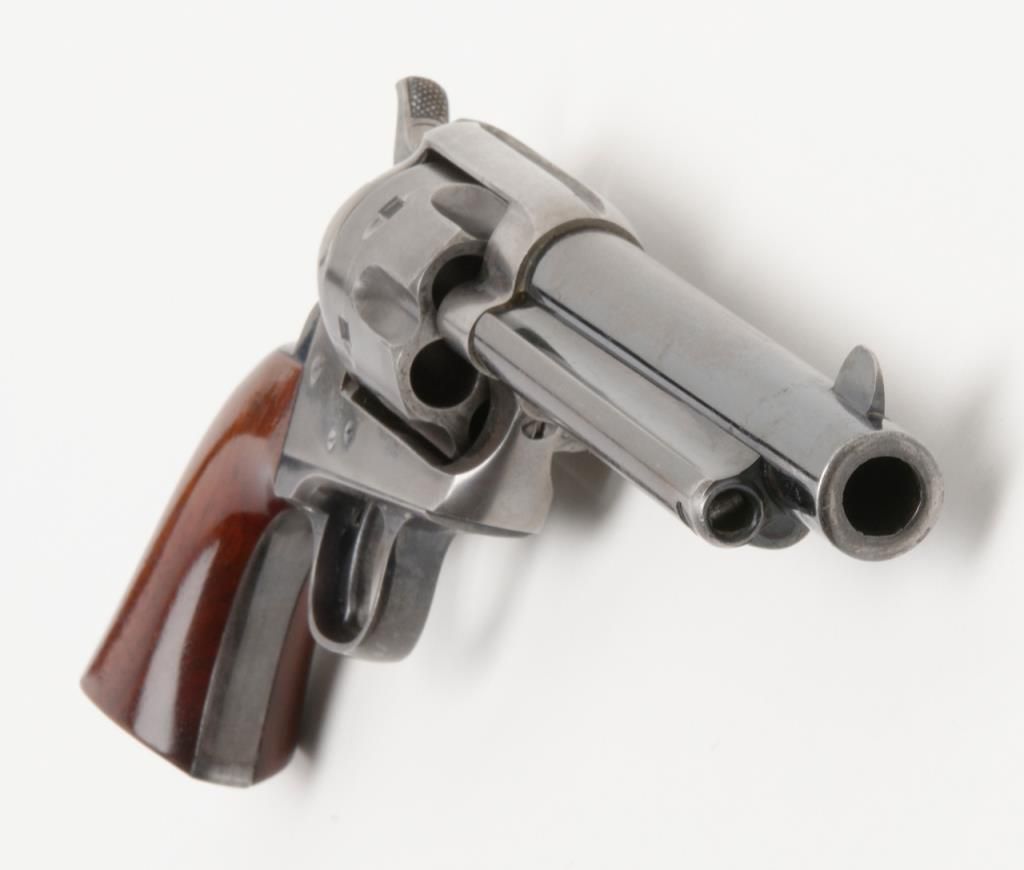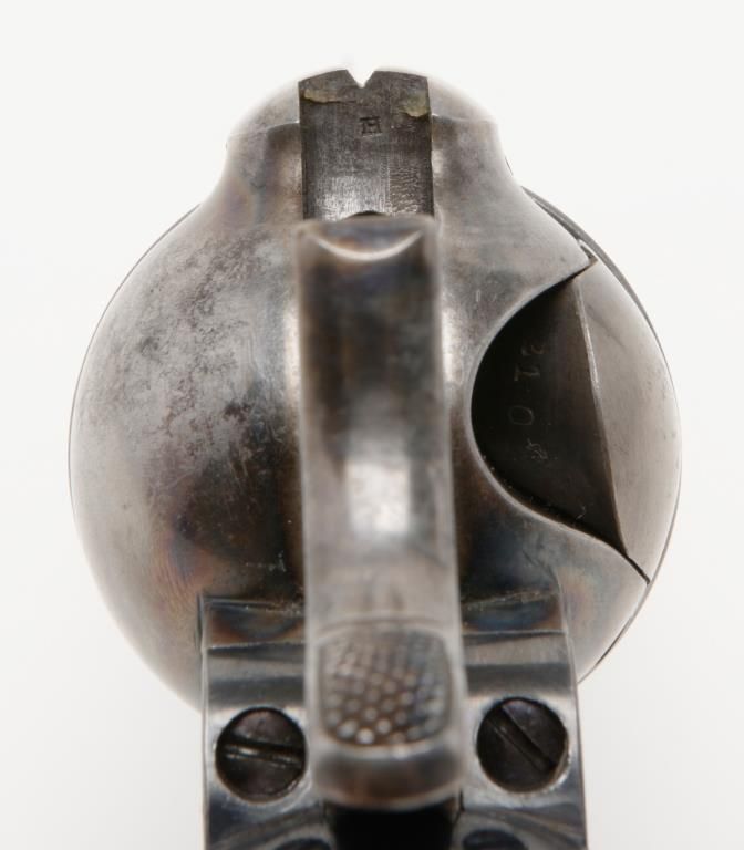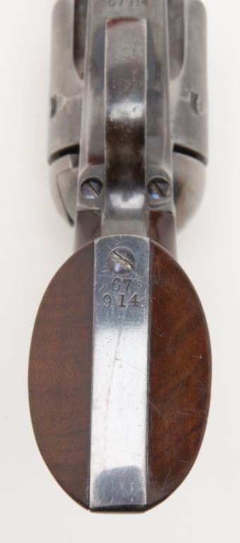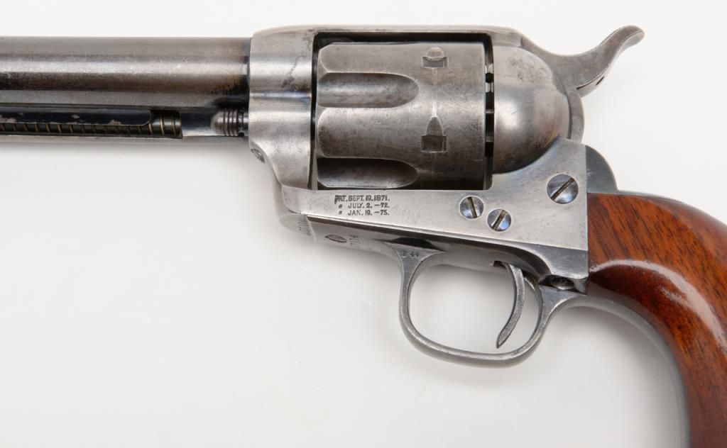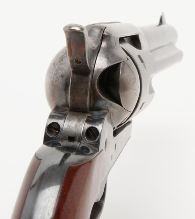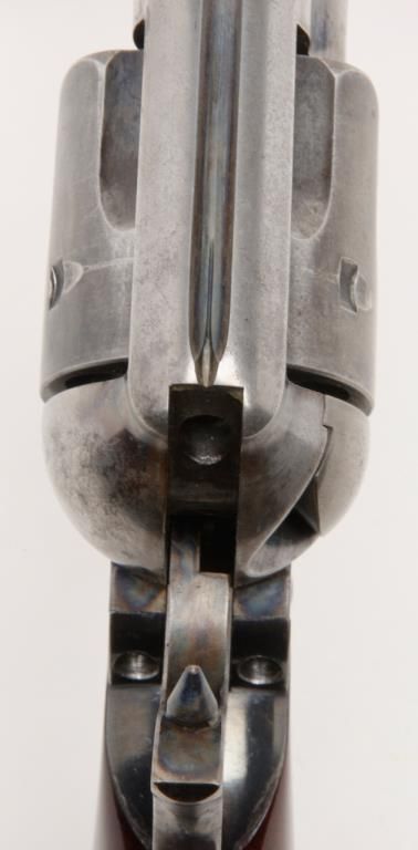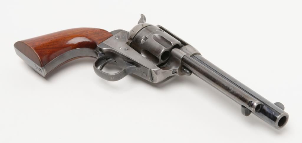 Very rare Colt SAA revolver, .44 S&W Russian cal., 5-1/2” barrel, blue and case hardened finish, wood grips, #67914 in overall fine condition showing considerable original blue on barrel, ejector rod housing and straps; traces of mutedoriginal blue finish in flutes of cylinder, several areas of original case colors on frame and considerable original case colors on hammer; crisp action, fine bore, fine grips with majority of original finish, “R 44” marked on left fronttrigger bow; accompanied by three factory letters dated April 2, 1959, Nov. 4, 2005 and Sept. 6, 2013 confirming caliber, barrel length and blue finish with type of stocks “Not Listed”; Special Notation on last two letters is “Pruss.”; allletters note shipment to Colt’s London Agency, London, England, shipped May 26, 1881, 12 guns in shipment. The 1959 letter also notes: “The revolver listed above appears to be a genuine COLT and the reason the Colt trade-mark is not stamped on the frame was due to the fact that we did not start stamping the Colt trade-mark on the Single Action models until about 1891 or 1892”. (letter signed by R.H. Wagner, then Manager of the Parts & Records Dept.). According to The Official