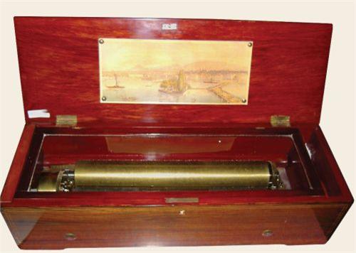 Tres rare boîte à musique «Piano Forte» en parfait état. Très jolie marqueterie géométrique. Variations de la sonorité due aux deux claviers. Longueur du cylindre: 33cm. Geneve env. 1840