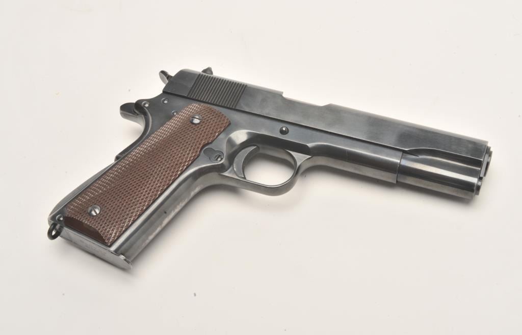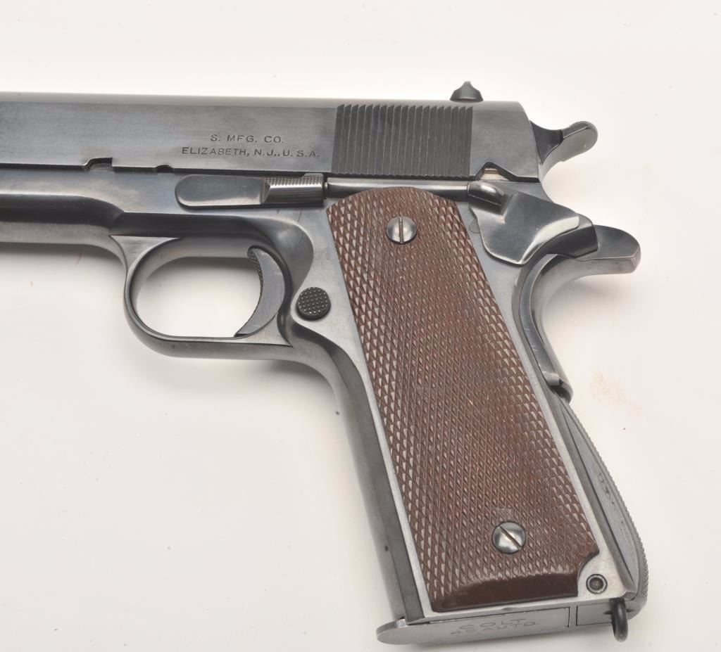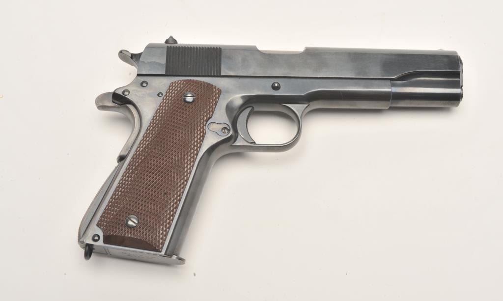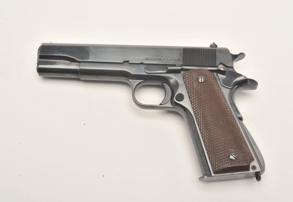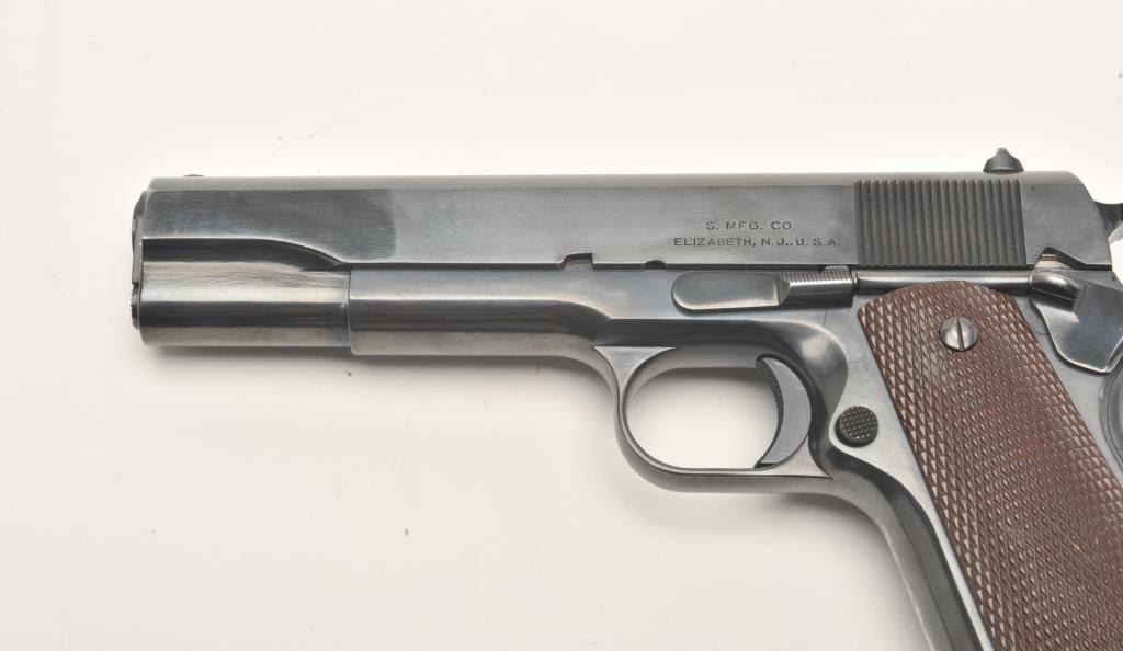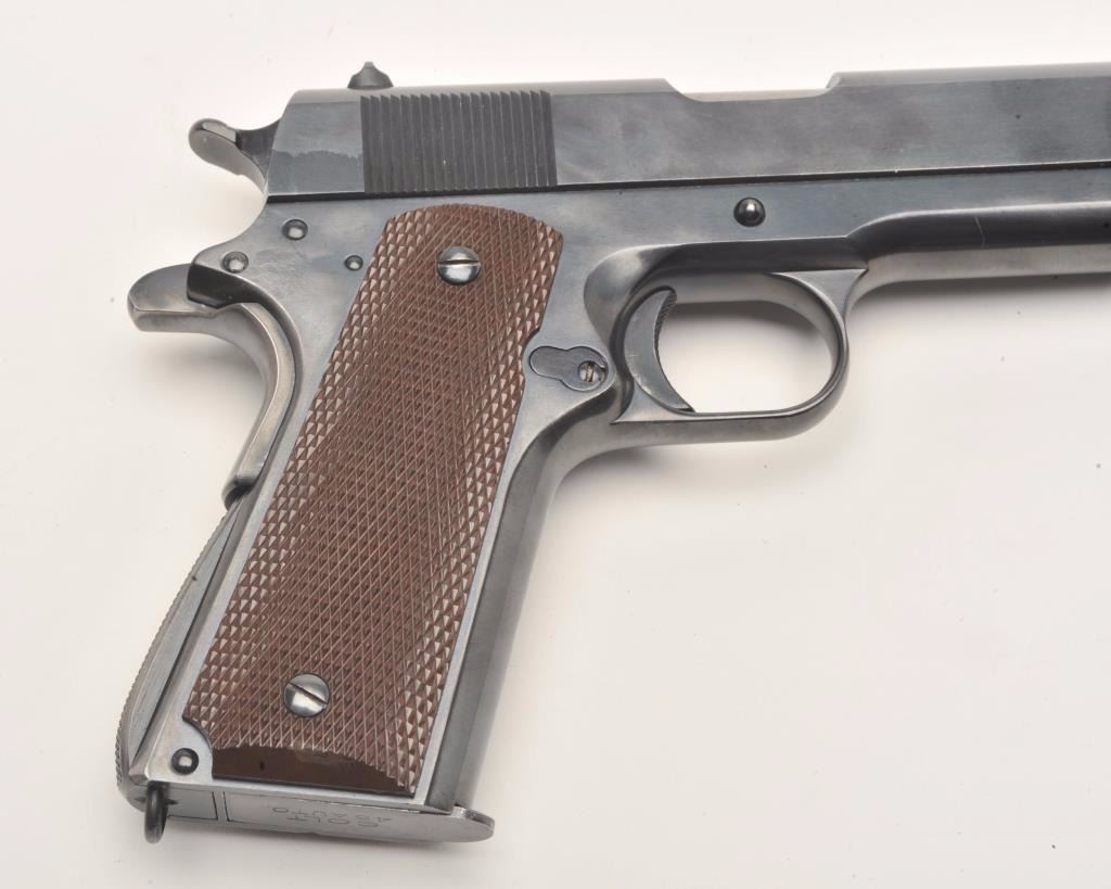 Very rare and highly desired Singer Mfg. Co. Model 1911A-1 semi-automatic pistol, .45 caliber, 5” barrel, blued finish, brown checkered grips, no visible S/N, in overall excellent condition displaying approximately99% blued finish to metal surfaces, fine bore, crisp action, sharp markings and fine grips; no inspector markings. (C&R/PPT). Est.: $12,500-$25,000.