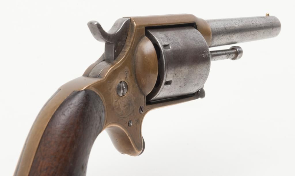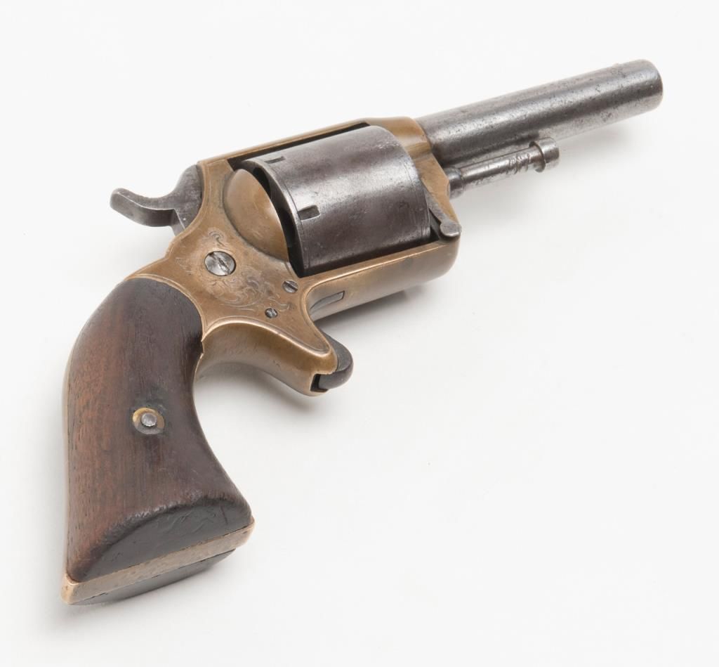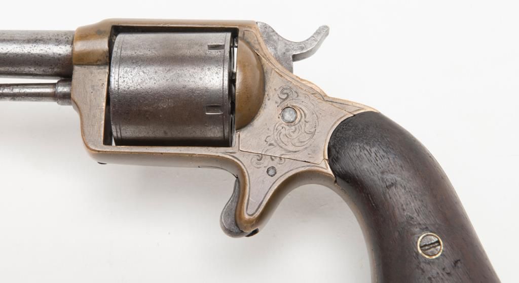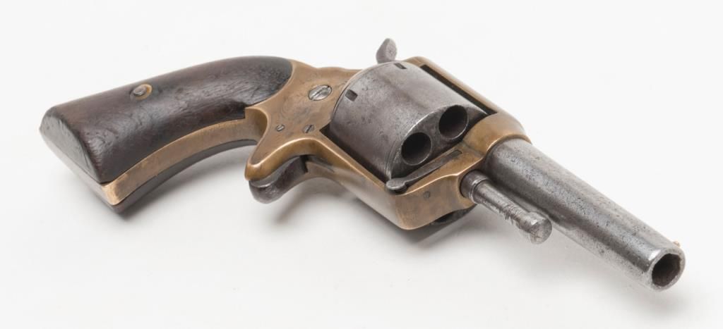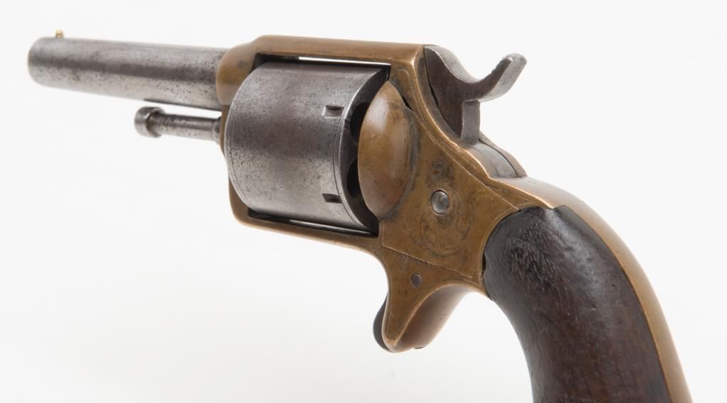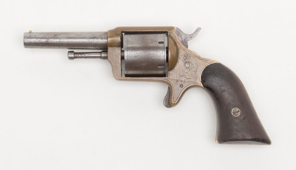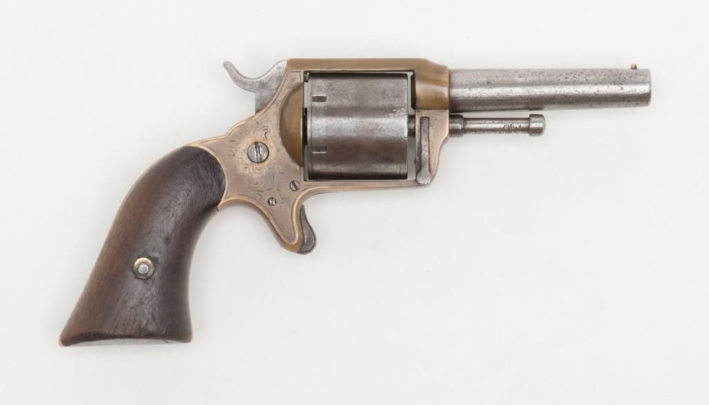 Very rare rim-fire cartridge revolver with brass frame in .32 caliber attributed to James Reid, serial number 5 with many unique and interesting variations. The revolver measures 7 7/8” overall with a 3” barrel and six shot cylinder. The center pin is released by a spring latch mounted on the right side that enables the cylinder to be removed for loading. The barrel is unmarked and there are other markings other than the serial number 5 on the back of the cylinder. The revolver differsfrom other James Reid in the fact that it has no loading gate. The condition is good to very good with a gray to brown patina with some minor pitting and erosion. The frame shows a dark unpolished natural brass patina. The grips aregood with some wear at the edges, small losses and normal aging. The action. A very interesting American revolver which is most similar to James Reid who was famous for his knuckle dusters and this revolver may be researchable through hispatent drawings. Est.: $400-$800+
