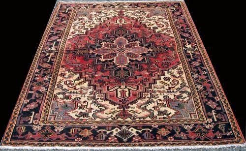 Very rare size charming high quality Persian Heriz Rug. 100% natural, hand woven, vegetable dye, worsted wool pile on cotton foundation. This is an enchanting Heriz rug of unique size and colors. Please note that Heriz rugs of this size are a rarity and hard to find in the marketplace. Also please notice the sophisticated and artistic pattern, representing man's intrinsic genius striving for beauty and perfection. This phenomenon becomes even more intriguing when one is reminded of the fact that, the weavers (women of the household) who weave these rugs have very little education, if any at all. Heriz is a town located in northwestern Iran. Heriz rugs are known and valued for their artistic and colorful character. These rugs have their own very unique style and therefore are distinguishable from other styles. Heriz rugs do not have high knot counts; however, Heriz weave is very well packed and usually comes with a lush pile. This is a captivating example of a Heriz rug. Size: 6 feet 7 inches X 5 feet. Country of origin: Iran.