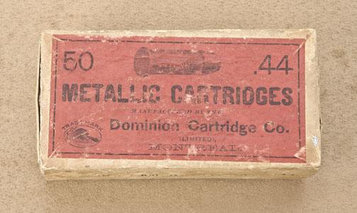 Very scarce full box of 50 Dominion Cartridge Company .44 Henry rounds with red cover label in very good condition with just some slight wear, all matching head stamps, some edge separation and missing two end flaps onthe cover but otherwise sound. Picture of Henry round at the top of the label. Est.: $2,000-$3,000.