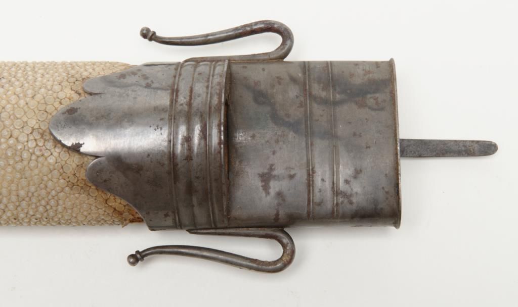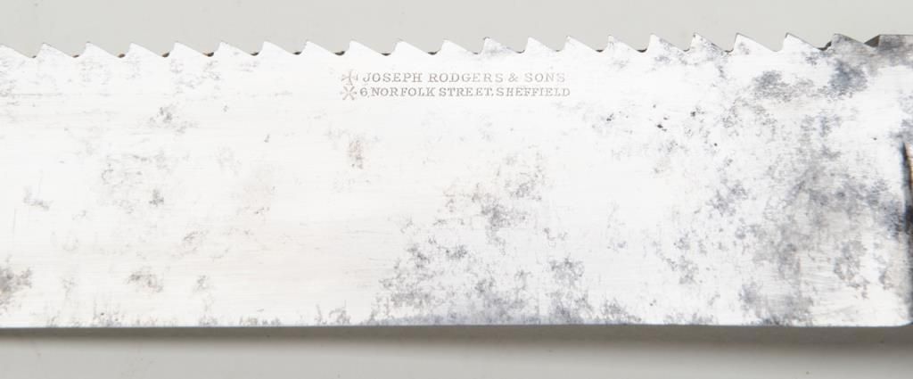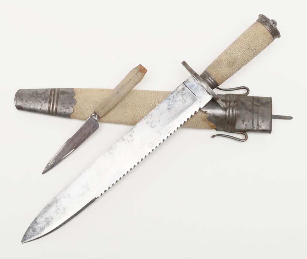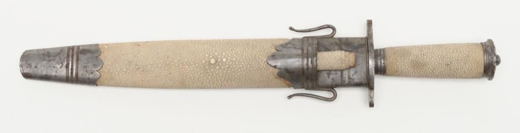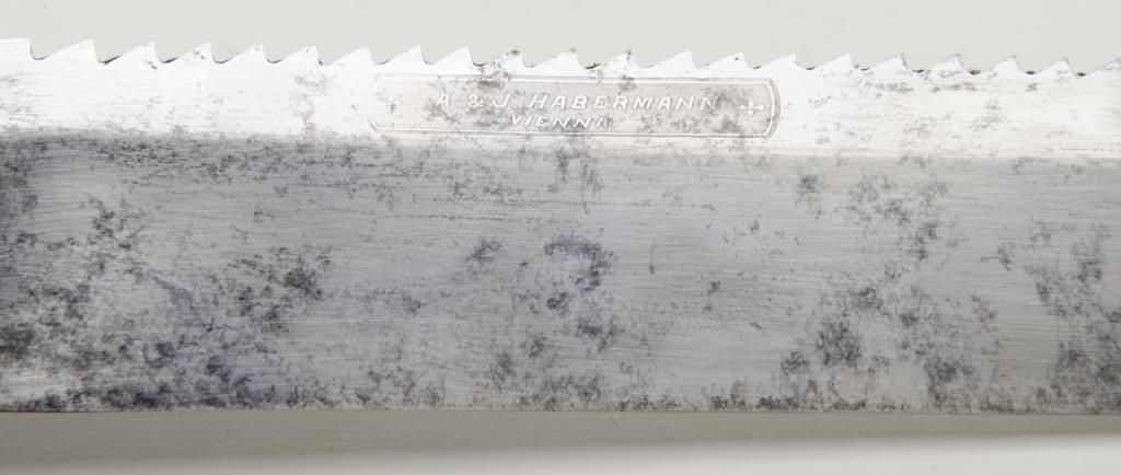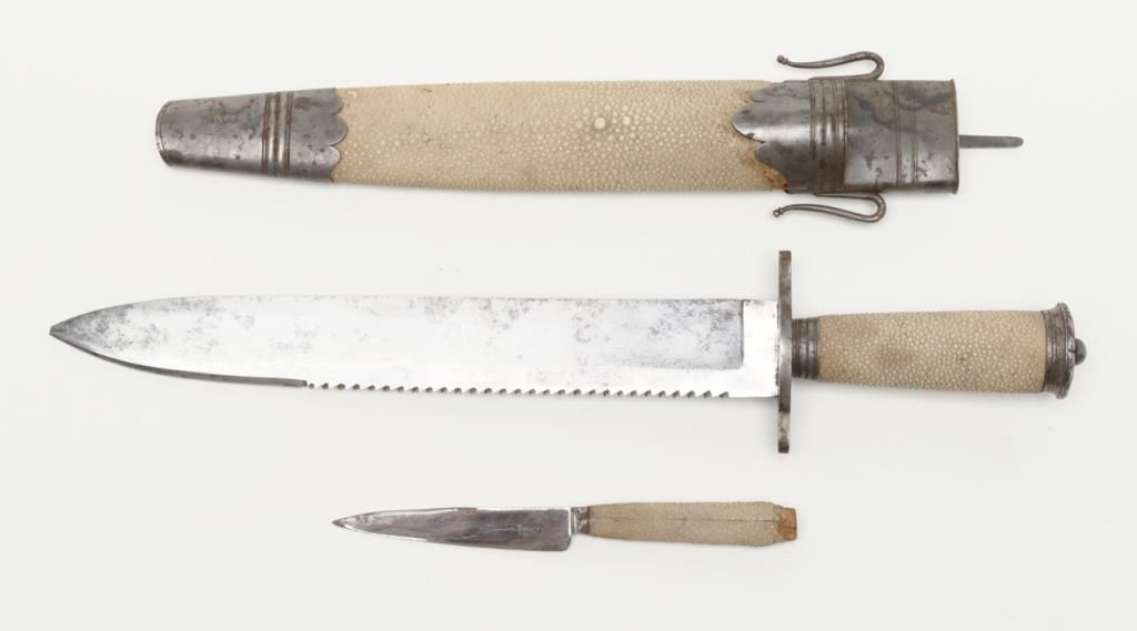 Very unusual and high quality English made for Continental market hunting sword roll die stamped by maker “Joseph Rodgers & Sons, 6 Norfolk Street, Sheffield” with reverse etched with dealer’s name “A & J Habermann, Vienna”. This hunting sword isin the German style and measures 16 ¾” overall with a 12 ¼” blade that measures 1 5/8” across the hilt and is of thick stock showing precision polish and the fine quality that Sheffield makers are known for. The back edge is serrated forwoodcutting and the blade shows a spear point. The blade is in good condition with some staining and minor beginning pitting and a very small loss to the tip. The mountings show traces of a light case hardened color and are naturally aging. The gripand scabbard are of select quality ray skin similar to the hide used for samurai sword handles. There is a matching small knife missing its butt cap within the accessory compartment. A fine and unusual hunting sword made by aprestigious English maker for the continental trade. Est.: $2750-$5500