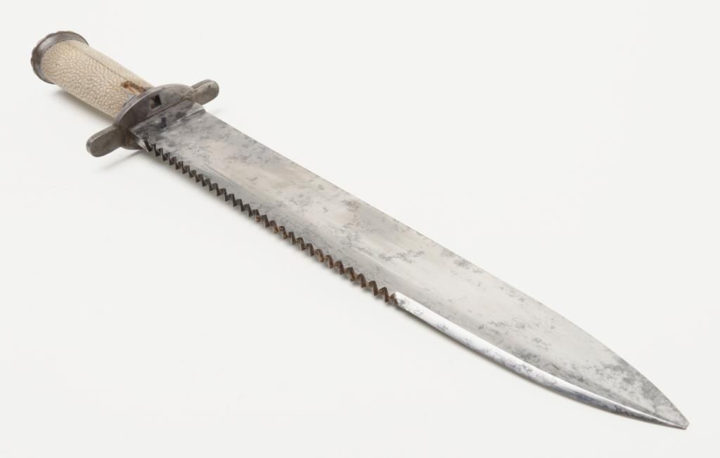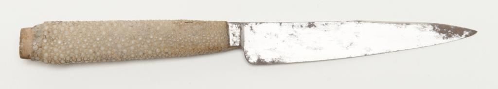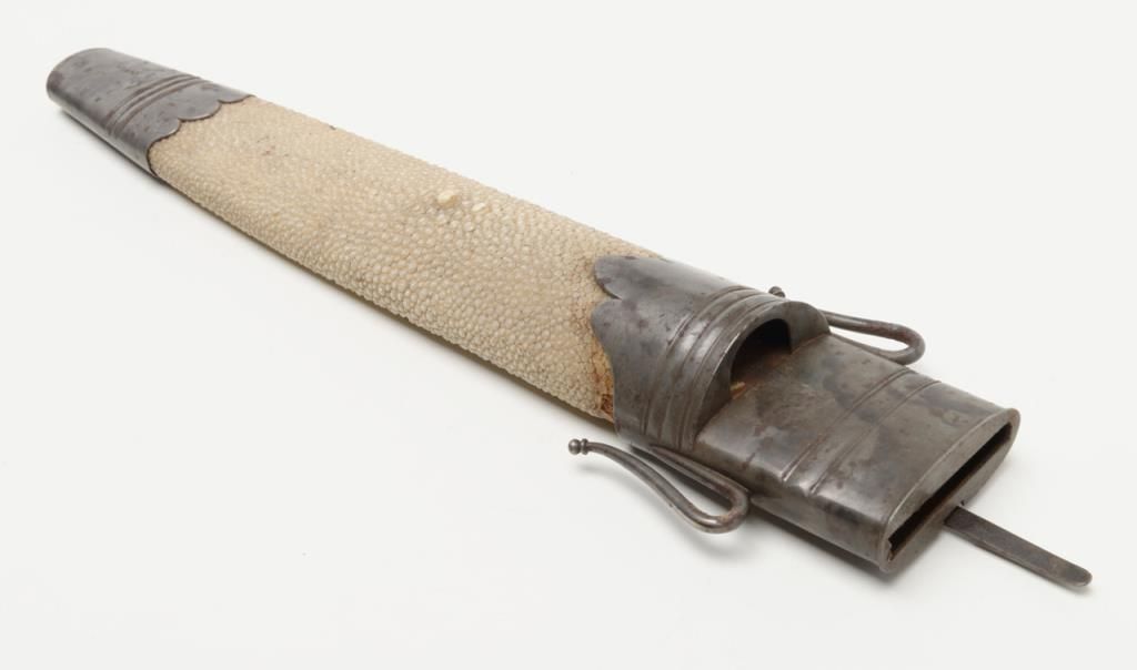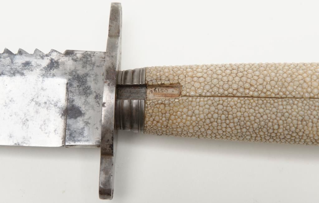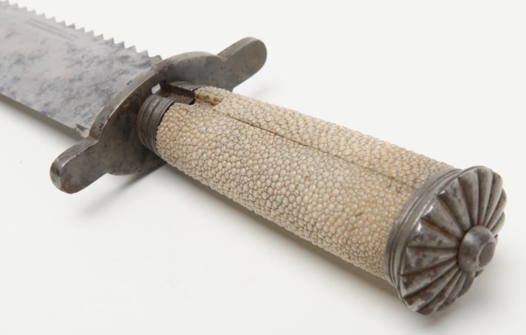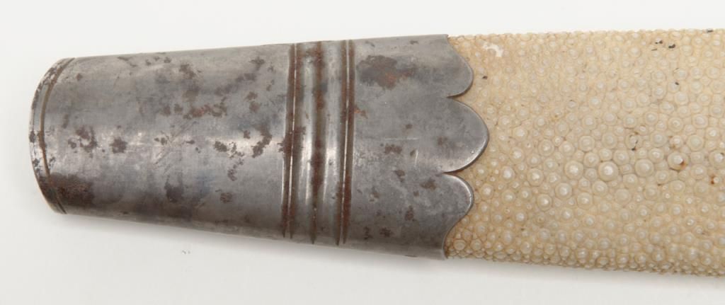 Very unusual and high quality English made for Continental market hunting sword roll die stamped by maker “Joseph Rodgers & Sons, 6 Norfolk Street, Sheffield” with reverse etched with dealer’s name “A & J Habermann, Vienna”. This hunting sword isin the German style and measures 16 ¾” overall with a 12 ¼” blade that measures 1 5/8” across the hilt and is of thick stock showing precision polish and the fine quality that Sheffield makers are known for. The back edge is serrated forwoodcutting and the blade shows a spear point. The blade is in good condition with some staining and minor beginning pitting and a very small loss to the tip. The mountings show traces of a light case hardened color and are naturally aging. The gripand scabbard are of select quality ray skin similar to the hide used for samurai sword handles. There is a matching small knife missing its butt cap within the accessory compartment. A fine and unusual hunting sword made by aprestigious English maker for the continental trade. Est.: $2750-$5500