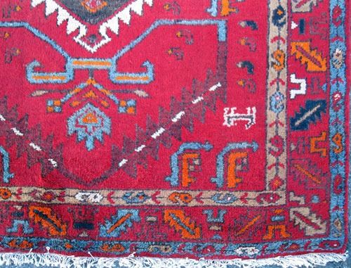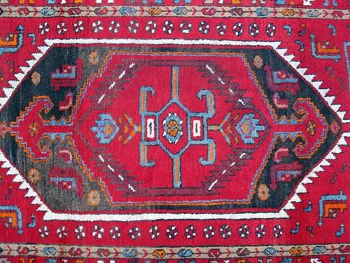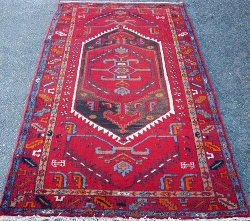 Very unusual design Persian asad-abad Hamedan Rug. 100%natural, hand woven, vegetable dye, wool pile, on cotton foundation. The village of asad-abad produces a very limited number of Hamedans. However, the limited few that are produced are superior in terms of wool quality, design and color scheme. It is intriguing to mention that these vibrant and charming pieces are woven by the women of the household with very little education, if any at all. This asad-abad Hamedan is a perfect example of man's intrinsic genius striving for beauty and perfection, and in this case, in the form of a hand woven rug, an art underfoot. This piece has a fairly lush and glowing wool pile, plus the well pronounced design, which is indicative of a superior quality. Please notice the stylized wine glass and broken leaves in the border. This asad-abad Hamedan is a diamond in the rough. Size: 6 feet 8 inches X 4 feet 4 inches. Country of origin: Iran.