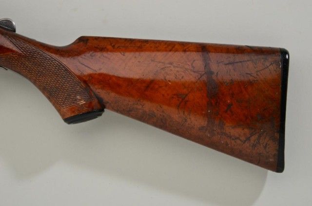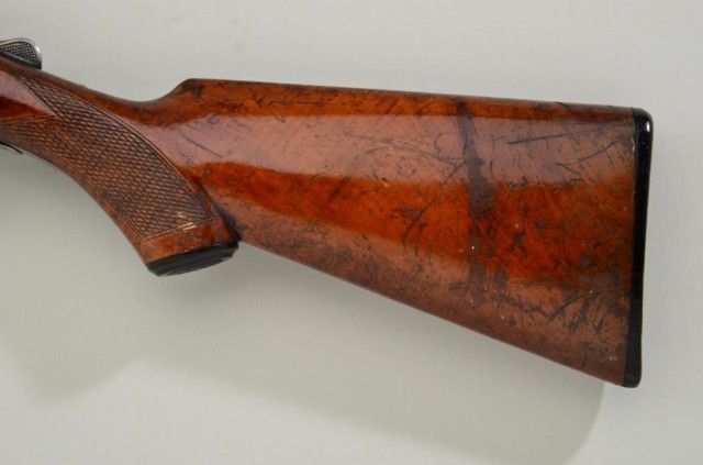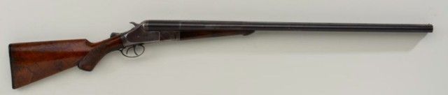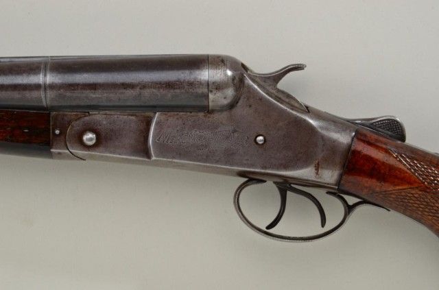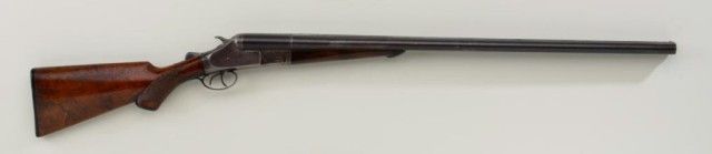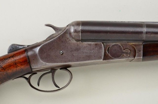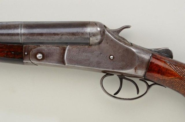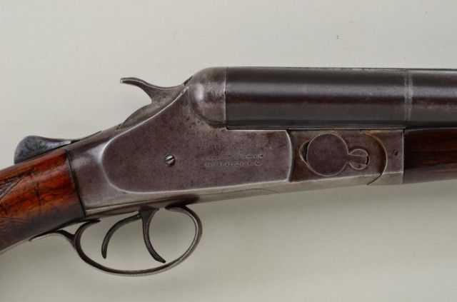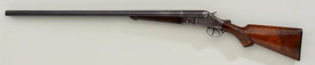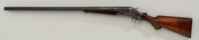 Very unusual double barrel exposed hammer SxS shotgun marketed under name “Nitro Hunter” with last patent date May 27th 1902 and PATENT APPLIED FOR. The gun shows 30” barrels and is 45-1/2” overall. Thecondition is good to very good with stock showing many scratches, mars and dings. The original Nitro Hunter marked butt plate is retained. The bores are fair with some erosion and the gun is choked improvedmodified both barrels. The locks work well. Est.;$175-$350.