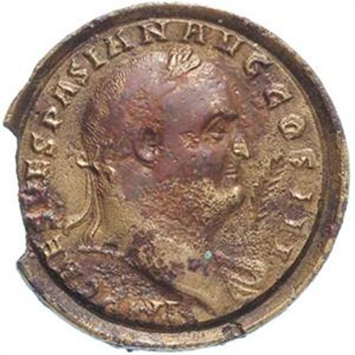 Roman Empire Coins. Vespasian (69-79). Contorniato. D/ IMP CAES VESPASIAN AVG COS III. Busto laureato di Vespasian a destra, con drappeggio sulla spalla sinistra. Nel campo, a destra, ramo di palma incuso. R/ Giovane Marte ignudo, con elmo crestato, avanza a destra con lancia e scudo. gr. 20.20 RRR. AE. Mancanza di metallo in corrispondenza del bordo da ore 8 a ore 10 del D/ e aree di ossidazione, altrimenti bel BB+. Mai comparso in asta.