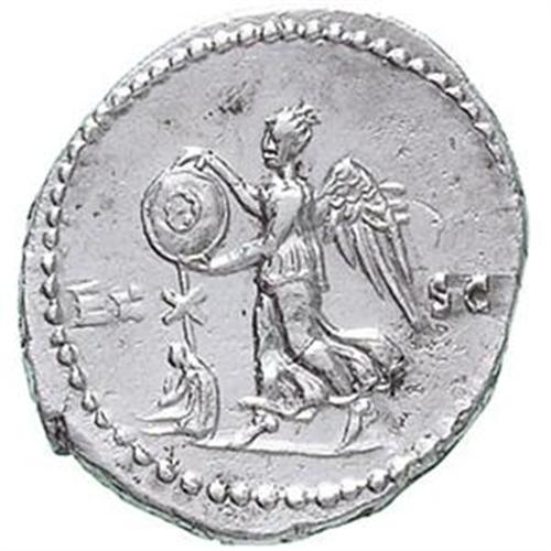 Roman Empire Coins. Vespasian (69-79). Denarius. D/ DIVVS AVGVSTVS VESPASIANVS. Testa laureata a destra. R/ EX SC. La Vittoria, stante a sinistra, erige un trofeo ai piedi del quale un prigioniero giudeo seduto a sinistra. RIC 59a. gr. 2.91 R. AG. SPL/qFDC.