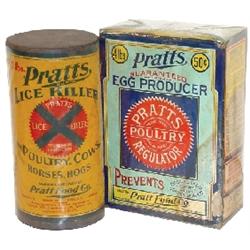 Vet medicine (2); Pratts Poultry Regulator & Pratts Lice Killer, colorful new old stock cdbd. containers full of original product, both VG condition & 9"H.