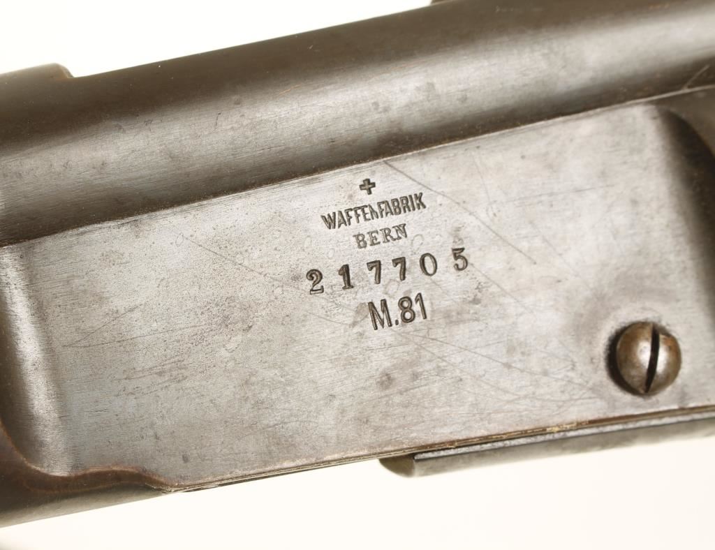 Swiss bolt-action military rifle with a blue finish and a 33.25" barrel with a 19" cruciform spike bayonet. Metal finish is brown patina with surface rust stains and light pitting. Nose cap has some major pitting on the top. Serial numbers match except for bayonet. Wood has cartouches with Swiss crosses and dents and dings. Bore is shiny with good rifling. Action is fine. Condition is fair to good