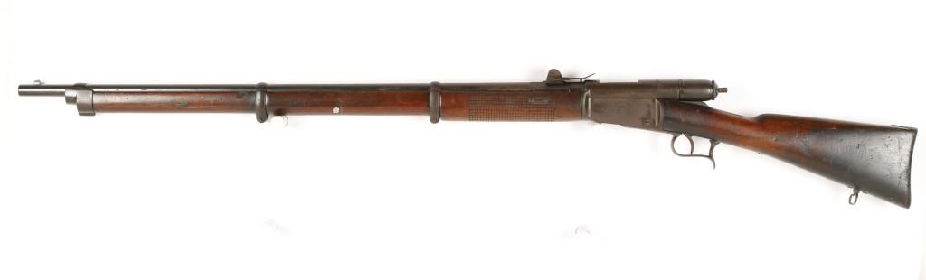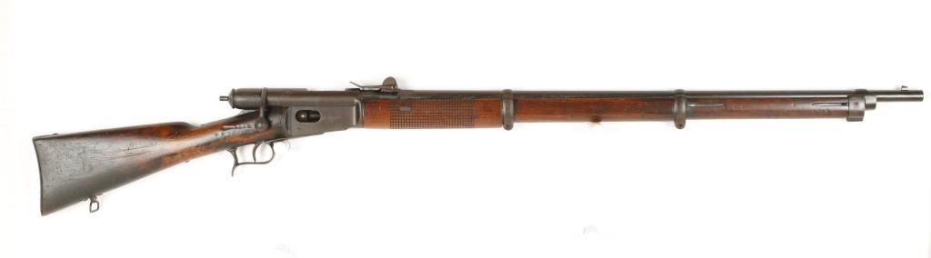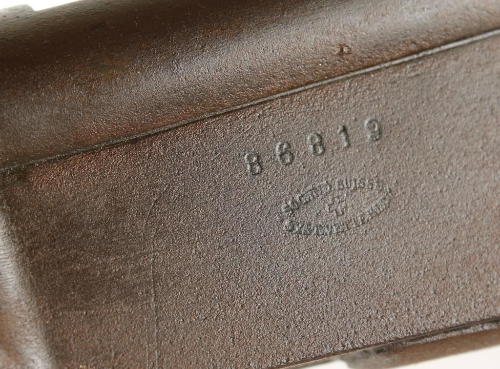 Early Swiss military bolt action rifle with 33" barrel. Still maintains original configuration with 11 round tube magazine. Good bore and action. Markings are faint. Condition: Fair showing scattered moderate pitting and wood shows darkening from age. Missing forward sling swivel. *Antique Firearm*